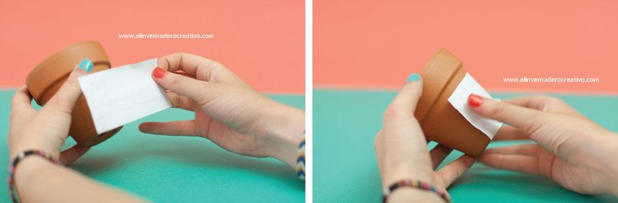 Con un trapo ligéramente húmedo frota para quitar la pulpa del papel. Irás viendo como aparece el diseño poco a poco. No frotes demasiado para no llevarte el diseño. Lo mejor es ir con cuidado. Sin prisa pero sin pausa. Con este último paso nuestro transfer en barro está termpiado. Ahora, opcionalmente, podrías aplicarle algún tipo de barniz o cera para que sea más duradero.