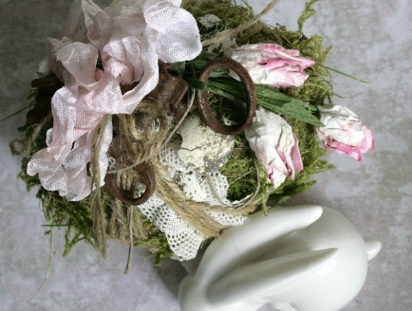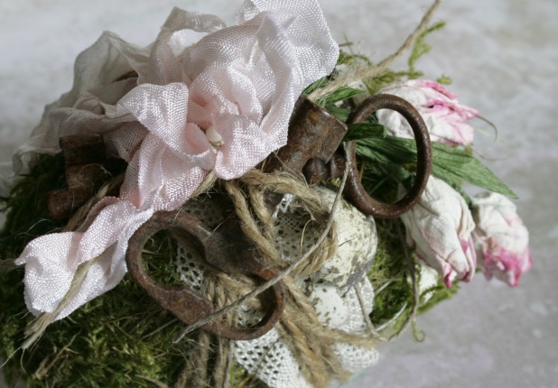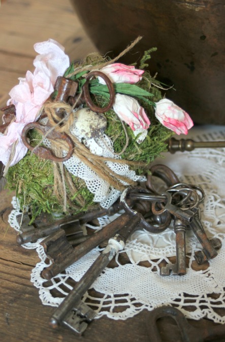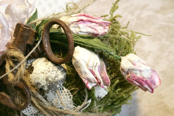 Encajes, cuerda, dos llaves muy viejas, algunas cáscaras de huevo de codorniz y cinta vintage (coloreada por mi) y listo! me encanta y no he tenido que comprar nada extra. (todo estaba por ahí jijiji)