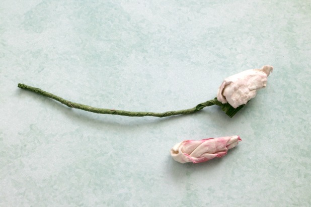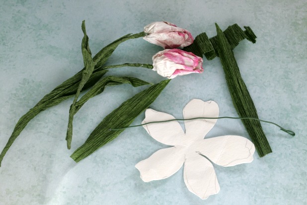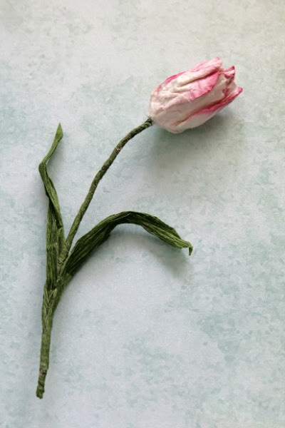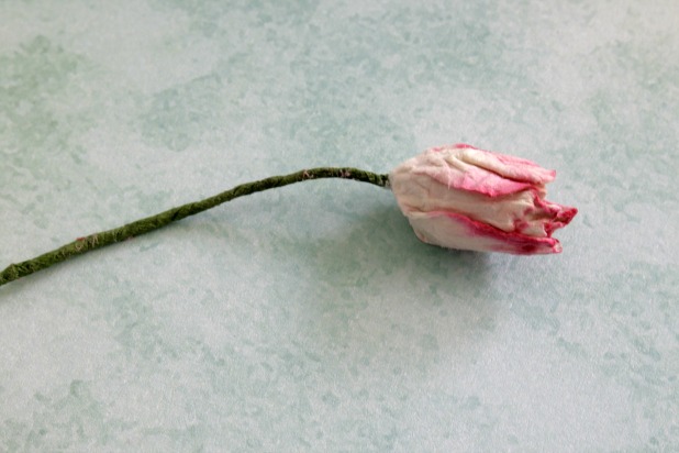 Para el efecto envejecido ya había dicho en el tutorial anterior (esta aquí) que rociamos la flor con agua (atomizador) y arrugamos. El agua va a hacer que la tinta corra dando un efecto especial. Sacamos una tirita del papel crepé y envolvemos el alambre poco a poco pegando también. Con un pedazo de papel acuarela vamos a hacer la forma del tulipán que irá fijada al alambre.