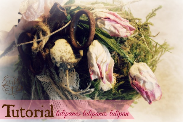 Un arreglo vintage claro! Los tulipanes van sobre un huevo de musgo. Bueno, es un huevo en icopor recubierto de musgo de mi jardín.