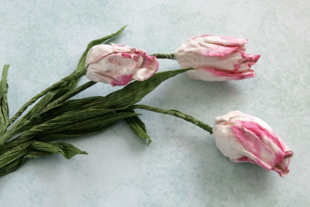 Con cuidado procedemos a abrir la flor arrugada y cubrimos la forma del tulipán (abombada en la parte inferior) y pegamos. El papel debe estar húmedo para poderlo moldear a nuestro antojo.