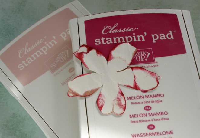 La forma de la flor se dibuja a mano alzada, puedes hacer 4 o 5 pétalos, la forma no es tan importante lo que sí debemos tener en cuenta es que los pétalos sean alargados. Recortamos con tijeras y entintamos, con varios tonos de un color.