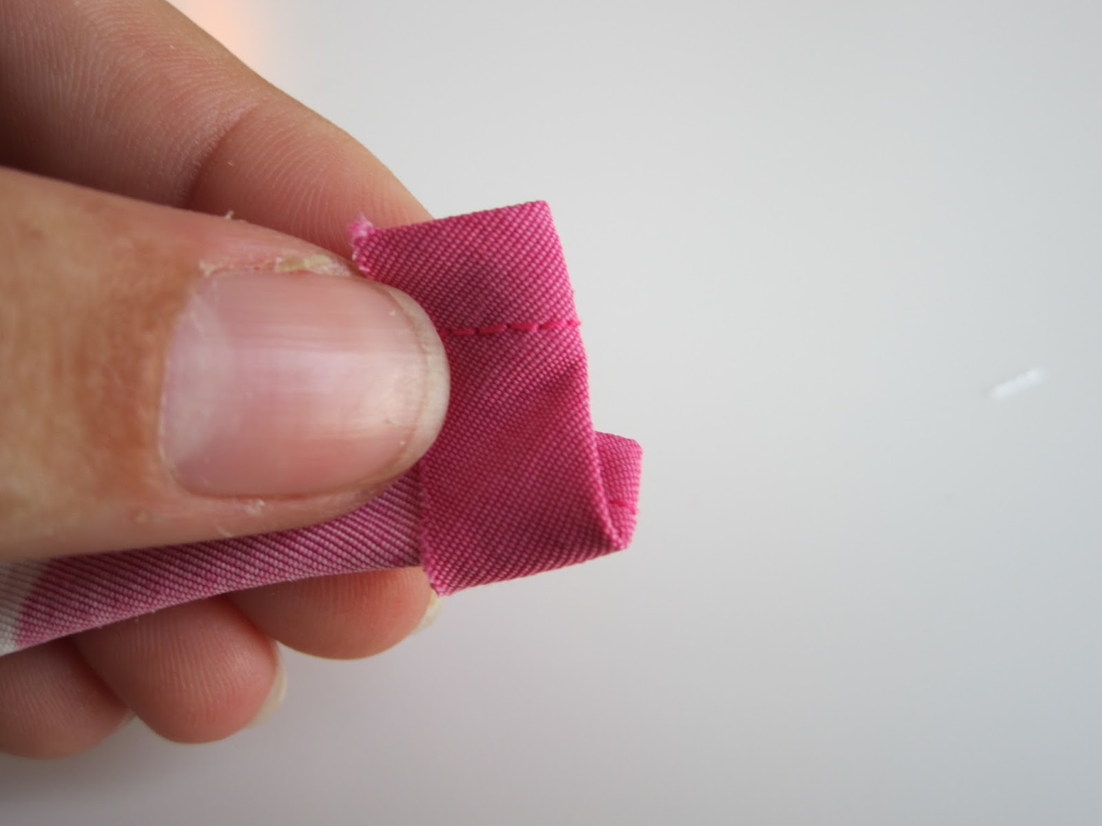 En uno de los extremos doblamos y pasamos un pespunte. ¡¡Ahora es el momento de probar el turbante a la muñeca!! Colocando el turbante alrededor de la cabeza, sujetáis con un alfiler en la medida que le quede bien, teniendo en cuenta que debéis dejar una abertura de 1cm más o menos en la parte inferior, donde irá el elástico. Dobláis y pasáis un pespunte.