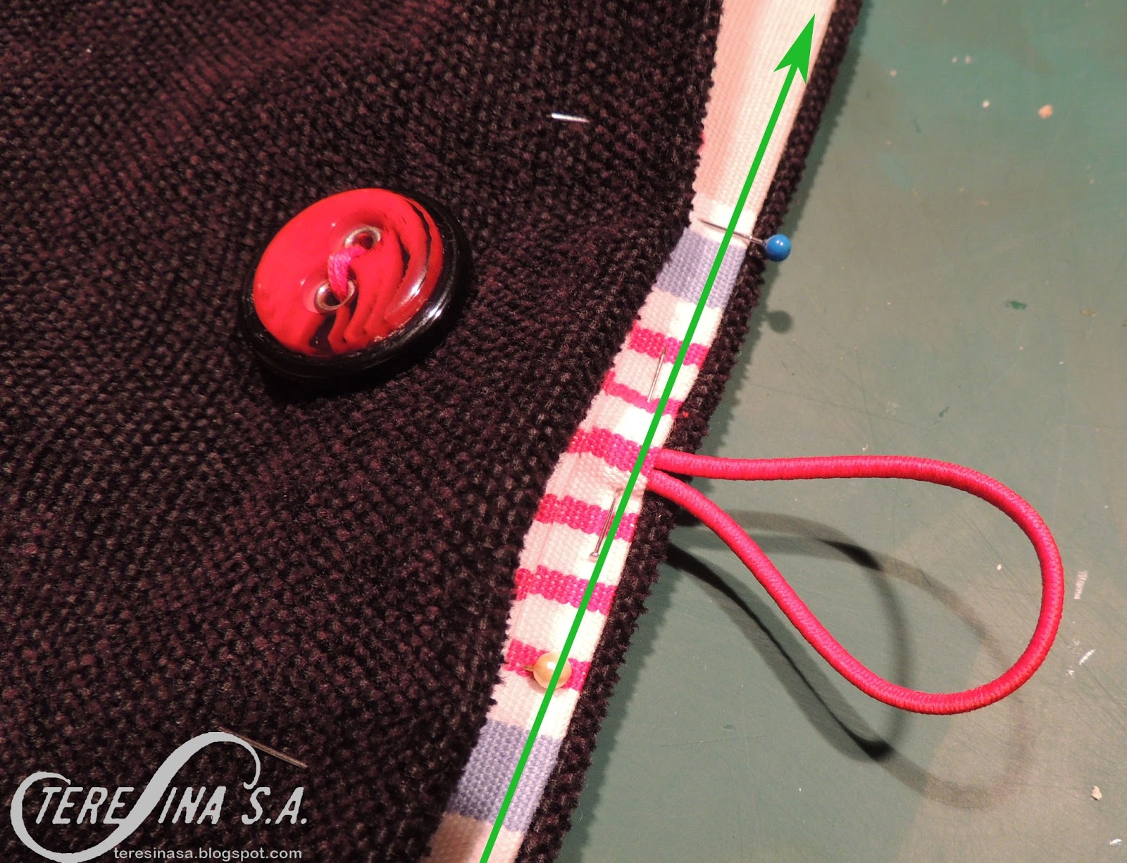 Fem una bora en un dels costats llargs (40cm) de les butxaques interiors de la roba vermella i la beix. Un cop feta la bora, la situem a 15 cm del costat superior de la roba interior de ratlles pel dret i l"agafem am agulles