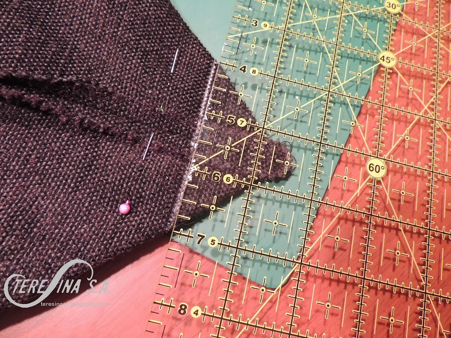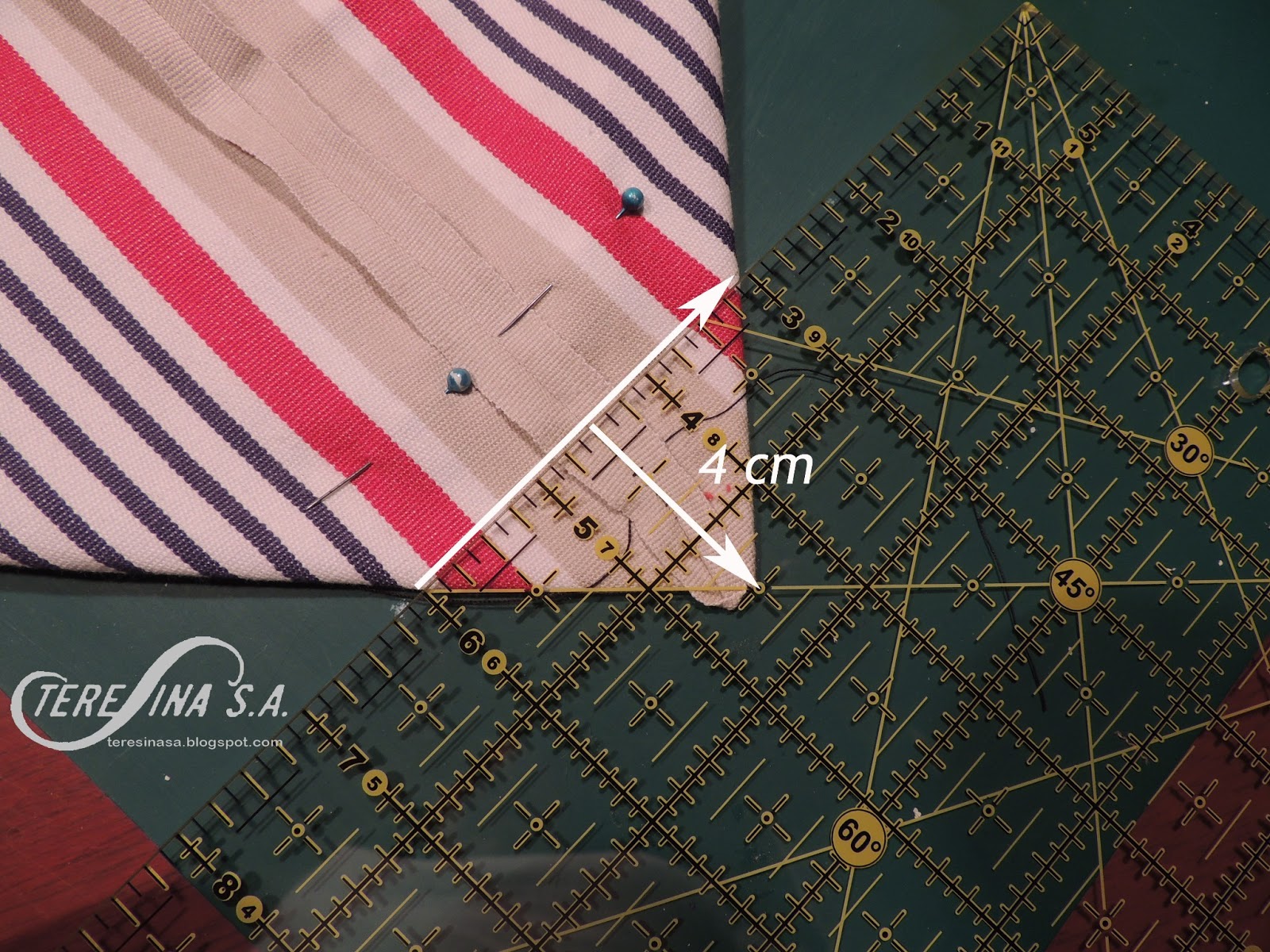 Ara hem de fer les cantonades inferiors. Per això pleguen el folre com es veu a la foto, i fem una marca a 4 cm de la punta.