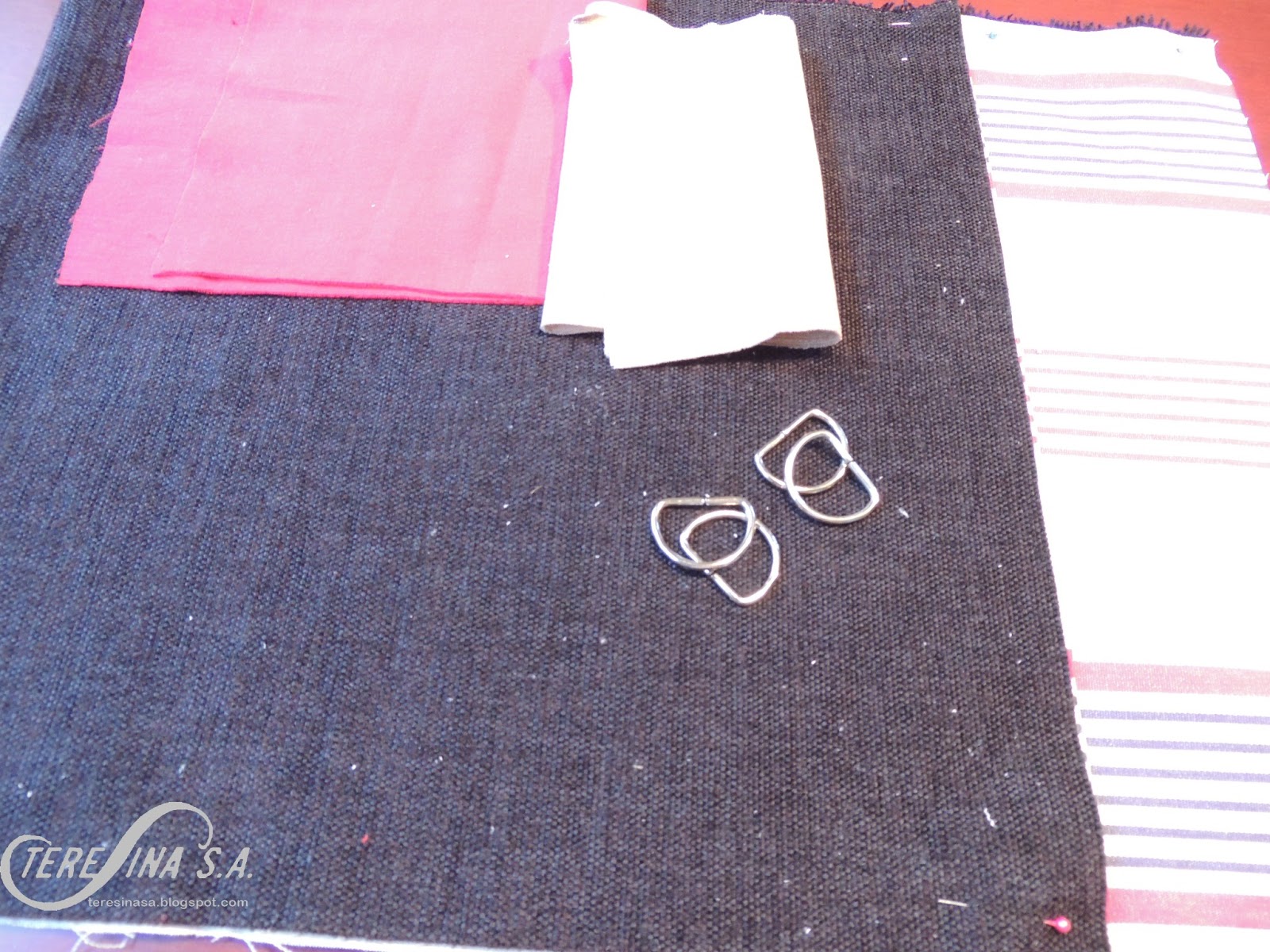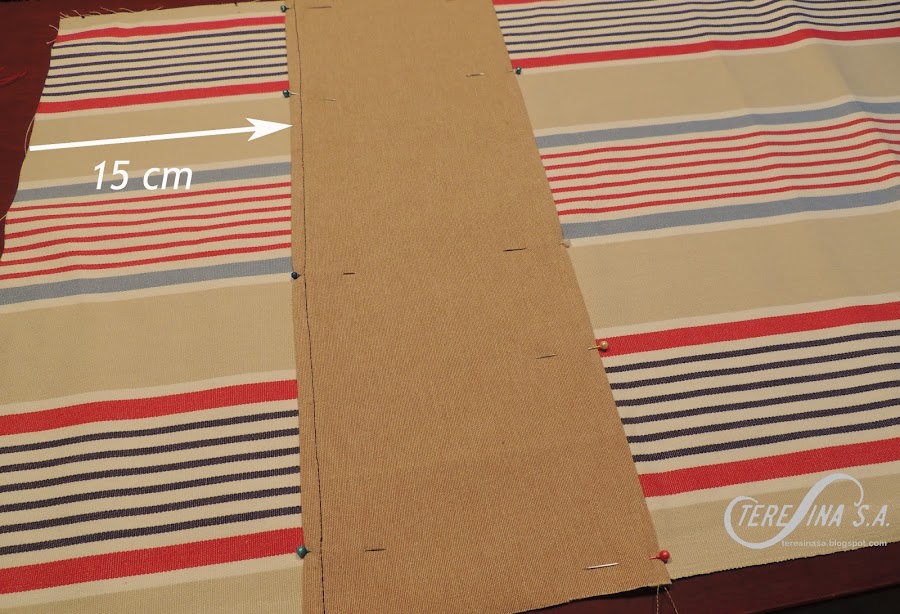 Per a les butxaques interiors: dos rectangles de 18 x 40 cm en vermell i beix (a conjunt amb la roba de ratlles). Totes dues comprades a Ikea