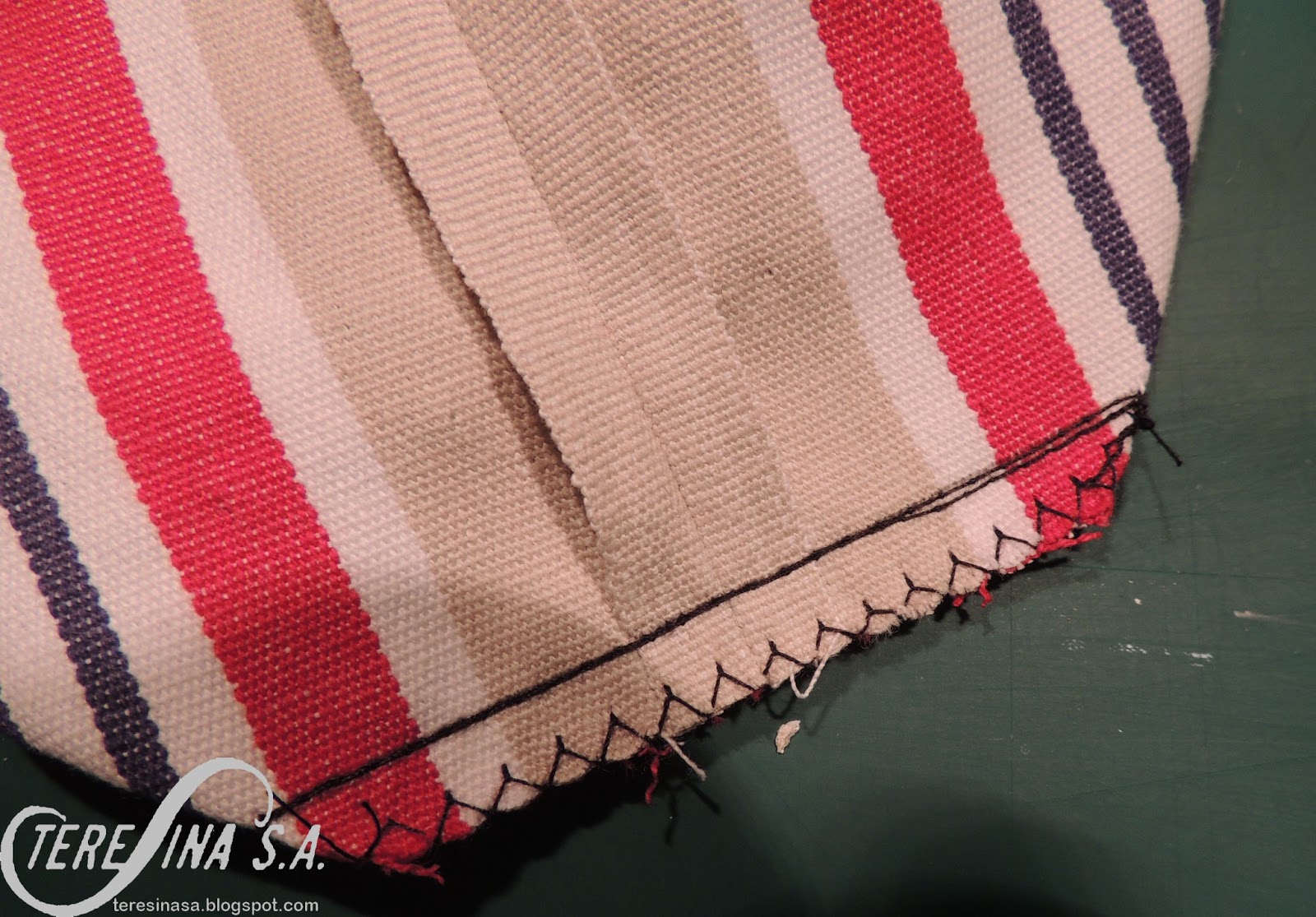 El primer que farem son les nanses. Cosirem juntes una de les tires llargues (95x5cm) vermella i una de ratlles per tota la llargada i un dels cantons curts, deixant 1 cm de marge de costura.Quan estiguin cosides, les girarem i les planxarem per que quedin ben planes.
