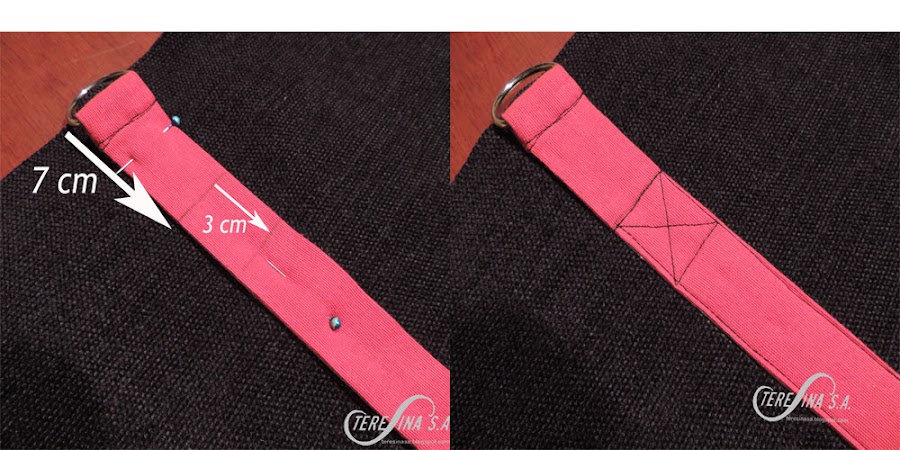 Als dos extrems, de cada una de les dues tires llargues, cosirem una de les anelles fent un doblec de 3 cm.