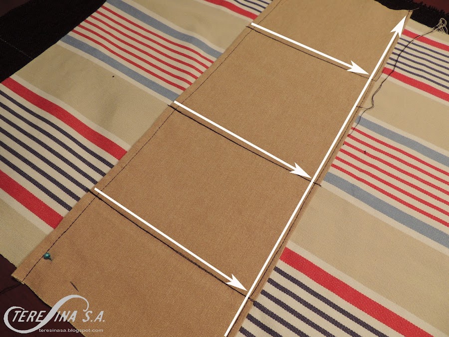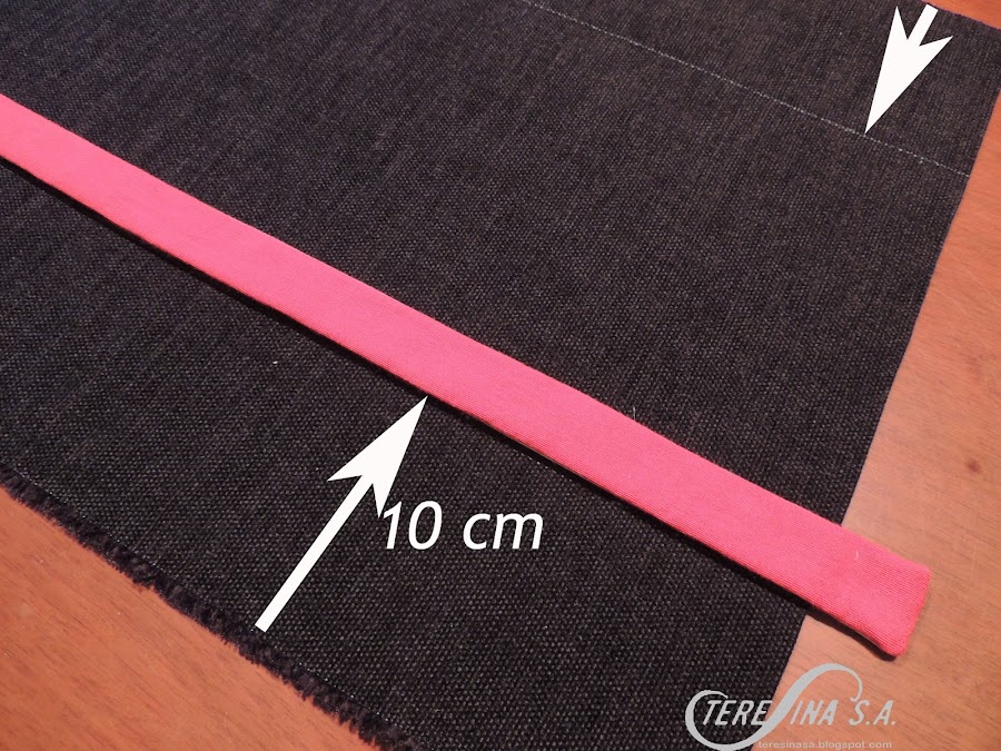 Posem les tires al seu lloc amb agulles i fem una marca a 7 cm de l"extrem que es fins on les cosirem. A 3 cm d"aquesta marca fem un altra que ens servirà per fer un quadrat de reforç de la costura.