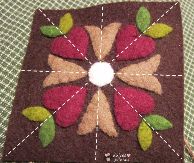 Para unirlo a la pieza central lo hacemos con una puntada de cruz.