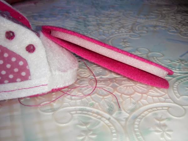Antes de colocar las piezas de fieltro blanco que dan el aspecto de lo que sería la goma de la zapatilla tenemos que hacer una especie de ribete a base de puntadas en la pieza que sería la goma inferior, para que simule la línea de color que suelen llevar este estilo de calzado.