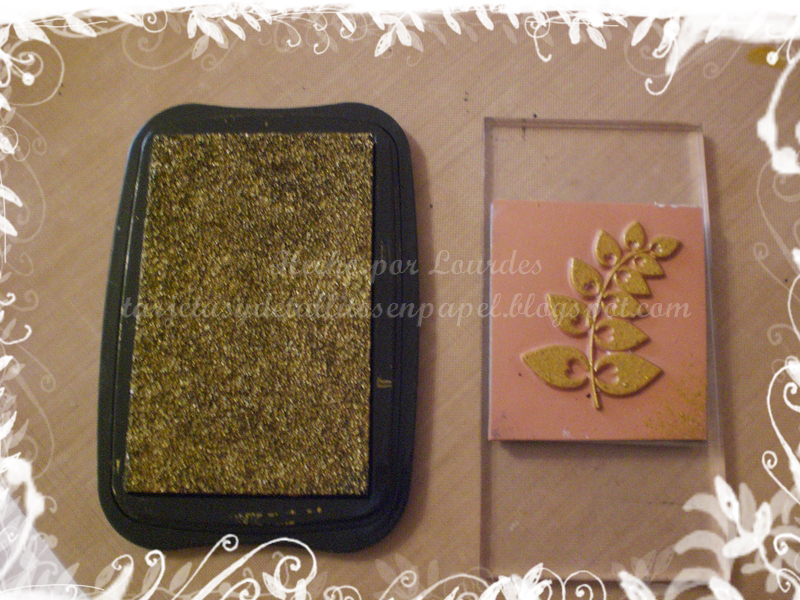 Entintar un sello de goma con tinta metálica y reservar. Nota: Este paso y los dos siguientes han de hacerse uno seguido del otro, por tanto ir preparando la pistola, el sello con la tinta...
