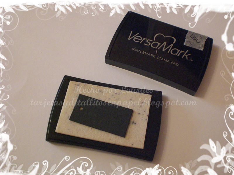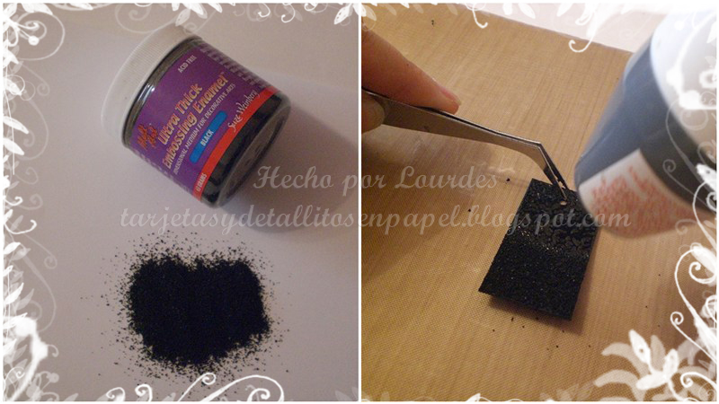 Colocar el UTEE negro sobre la pieza de cartón y con la pistola aplicar calor y derretir. Una vez frío. collocar Versamark de nuevo, aplicar UTEE y derretir (hacer este proceso 2 veces más).