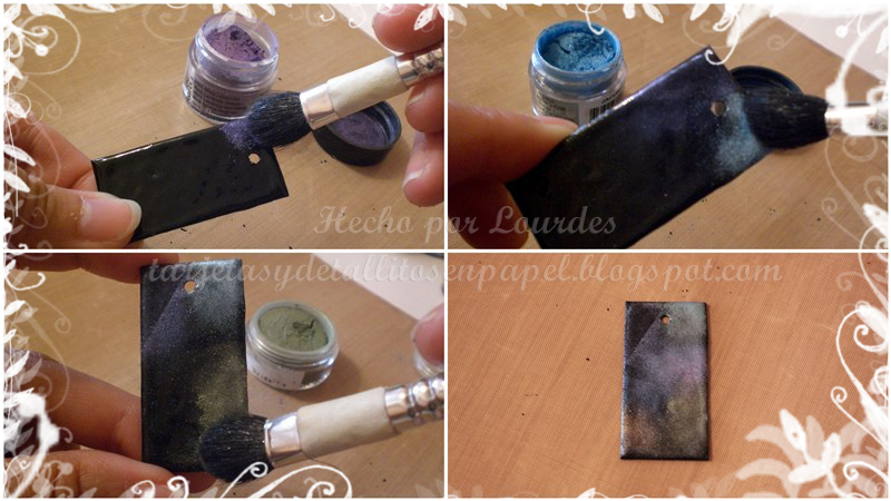 Ahora, usar de nuevo la Versamark para fijar los polvos de mica sobre la pieza. Con un pincel aplicar los polvos de diversos colores por toda la pieza