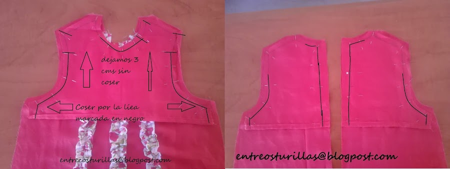 2.- Encaramos derecho con derecho y cosemos sisa y cuello, dejando sin coser 3 cms y los hombros, como se muestra en la siguiente imagen.
