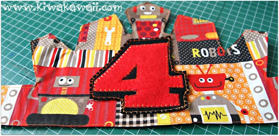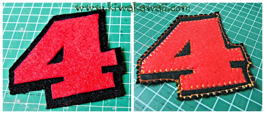 Ahora que tenemos la corona hecha, podemos añadir un número! Recortamos el número con fieltro. Yo he recortado dos piezas, una más grande que la otra y con colores a contraste, para que destaque bien el número en la corona estampada, y los he cosido con puntadas decorativas para decorar.