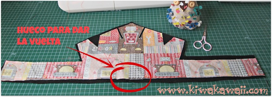Pasamos un pespunte por toda la corona, bien cerquita del borde. Con este pespunte quedará la forma bien marcada, y de paso cerraremos el hueco que dejamos para dar la vuelta.