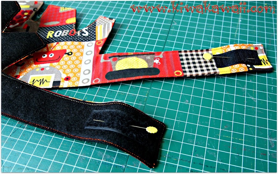 Ahora ponemos el velcro (o snap) en las tiras. Ten en cuenta que una de las piezas debe ir en el lado del fieltro y la otra en el lado de la tela, para que luego puedan cerrar correctamente.