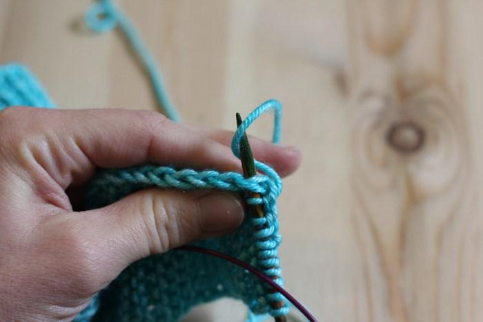 Al acabar de tejer los puntos del empeine, olvídate de momento de la aguja derecha y la hebra de lana. Coge la aguja izquierda y visualiza las hebras dónde montarás los puntos (el mismo número que en el otro lado).