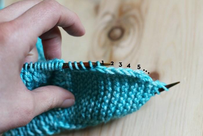 ¿Necesitas saber cuantas hileras has tejido? Pues simplemente cuenta cuantas V’s ves una encima de la otra. En el dibujo anterior tienes 6 uves que corresponden a 6 hileras.