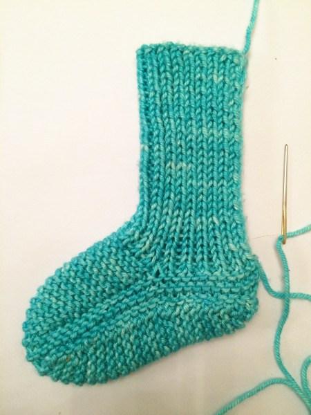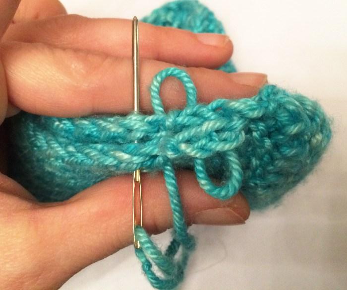 27. Después usa la misma hebra de lana para coser la caña desde el talón hacia arriba.