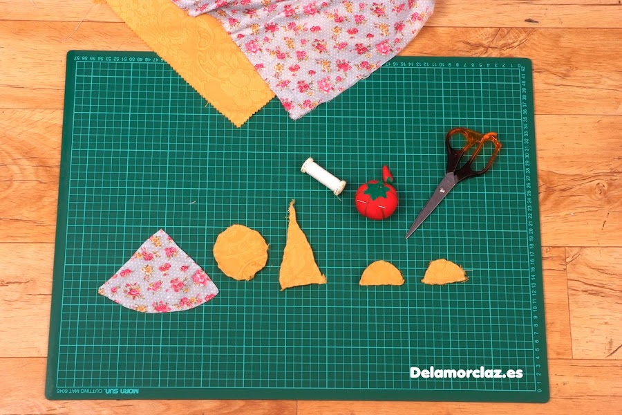 Recortamos los trozos de tela tal y como aparecen en la foto. A continuación encontraréis las medidas exactas y el plano.