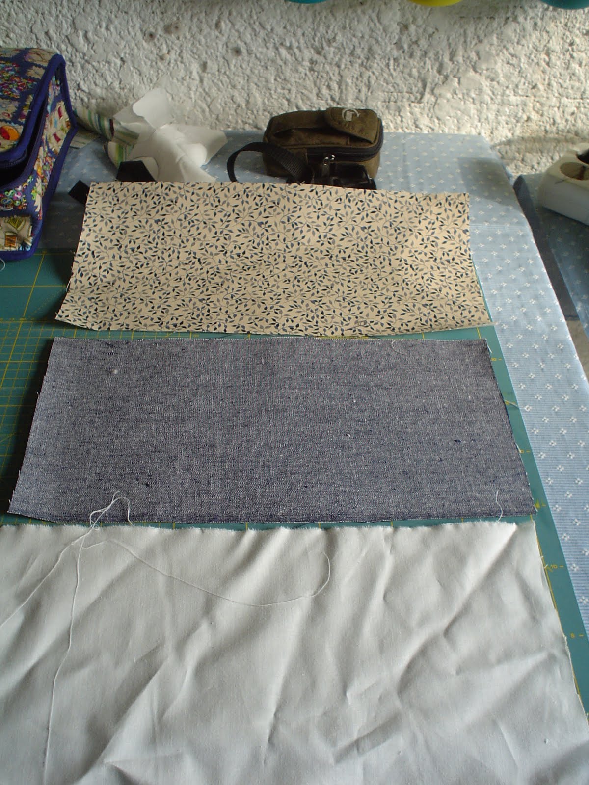 Primero cortaremos tres tozos de tela de la misma medida, uno en una tela de algodon cualquiera, no importa el color, ya que sera la base donde montaremos las otras dos telas, y los otros dos en telas claramente contrastadas para que se vea bien el dibujo.