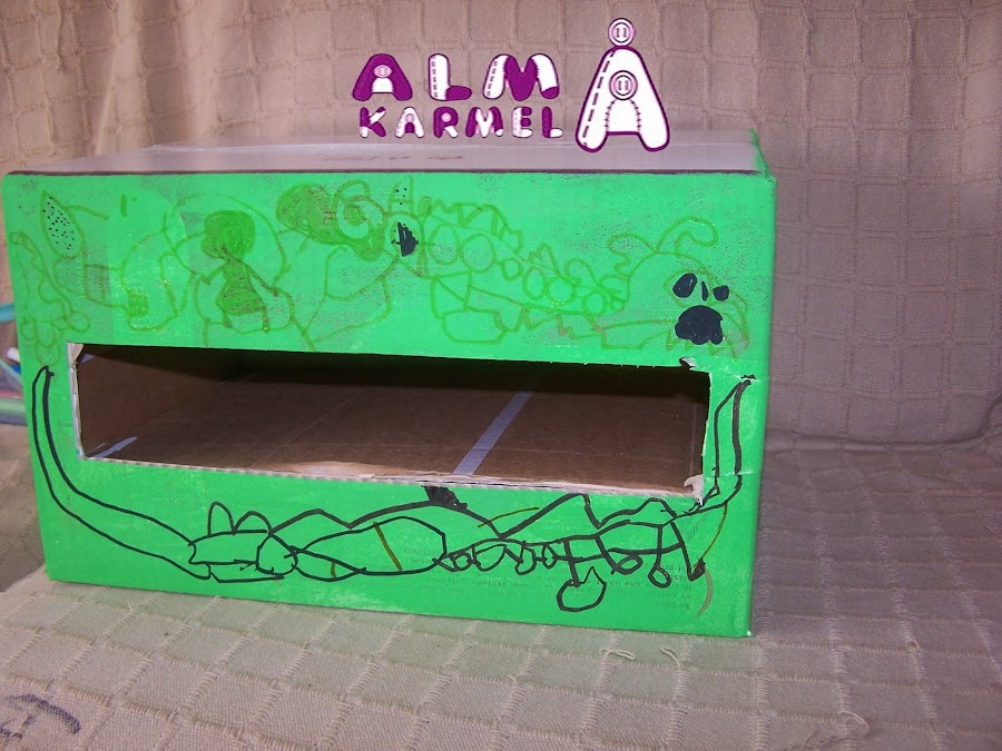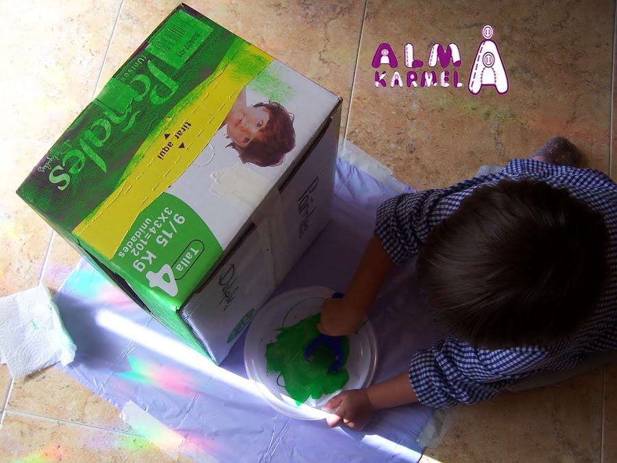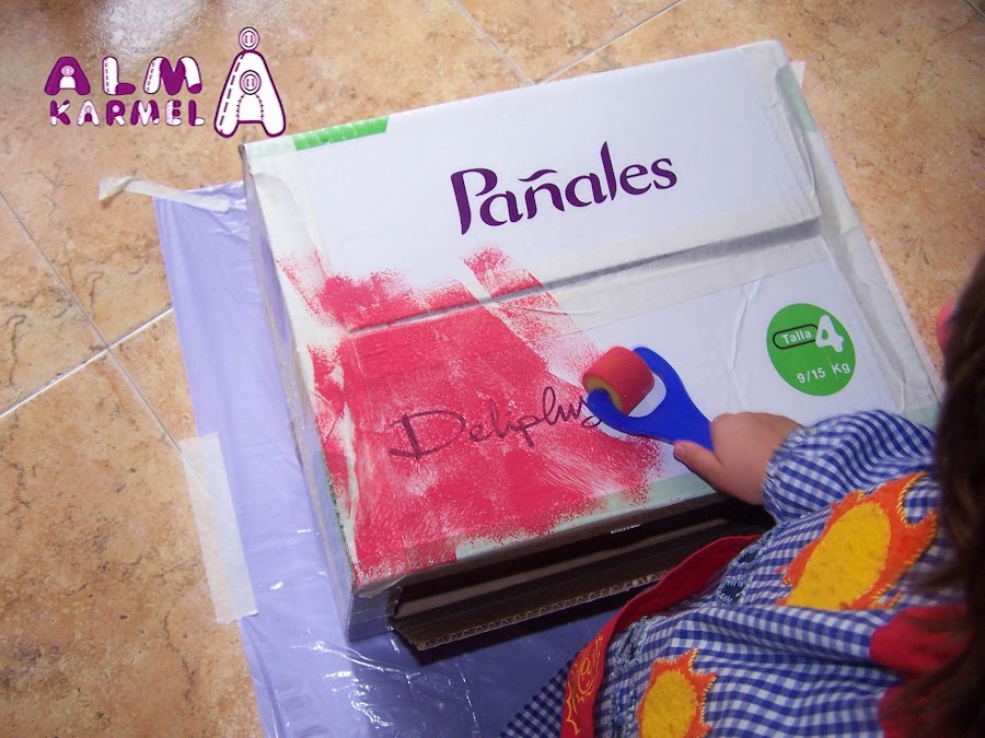 Lo ideal sería darle dos manos de pintura para que tape bien los dibujos y las letras de la caja, pero como la paciencia no es una virtud de mi niña, se quedó con una sola mano de pintura, jejeje