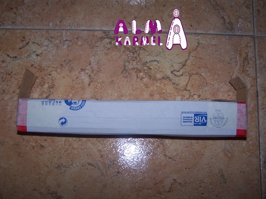 Para el cajón medí el agujero cortado y el fondo de la caja, y le di un par de centímetros más en tres de los lados, para así doblarlo hacia arriba y hacerle un poquito de fondo al cajón. Después corté un trozo un poco más grande que el agujero hecho, que será donde va pegado el cajón y el tirador para abrirlo. No sé si me he explicado, pero en las fotos creo que se ve claro ;)