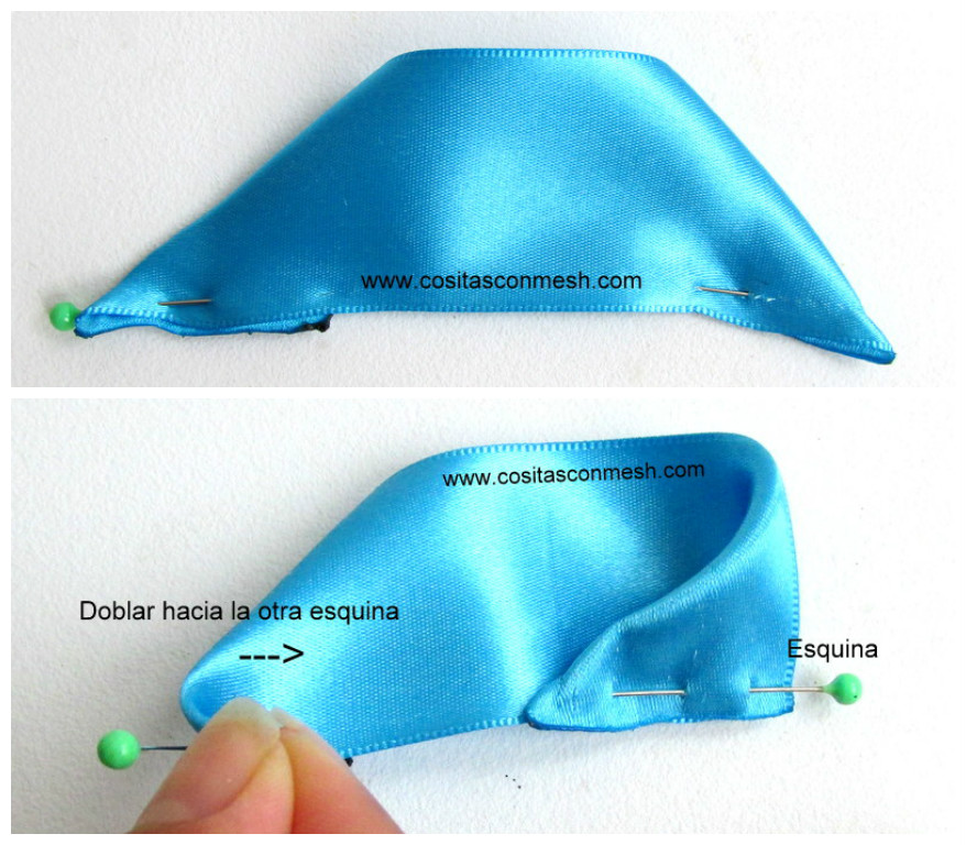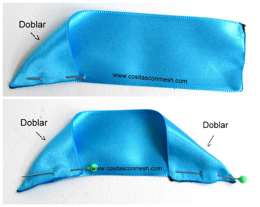 3.-Dobla cada punta del listón como lo indico en la foto, y sostenlo con un alfiler.