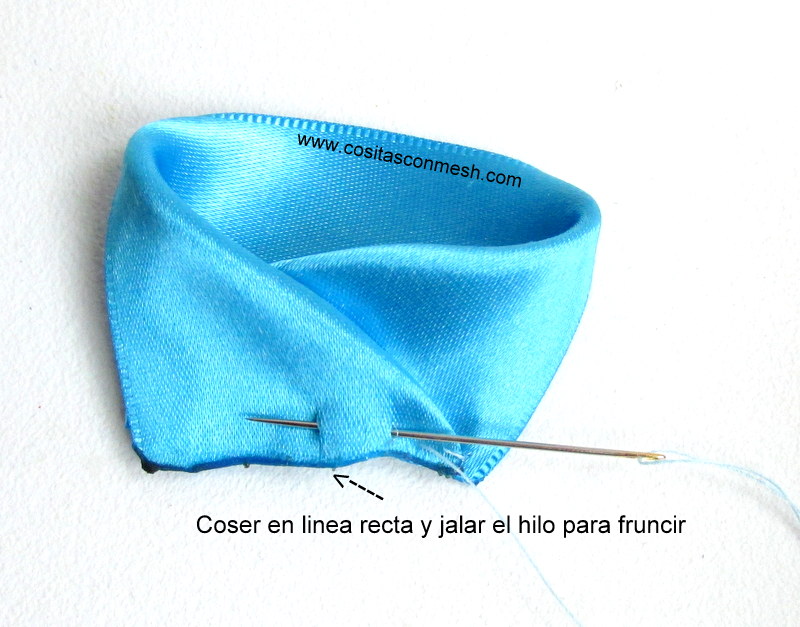 ** Con aguja e hilo del mismo color del listón, cosemos en linea recta.