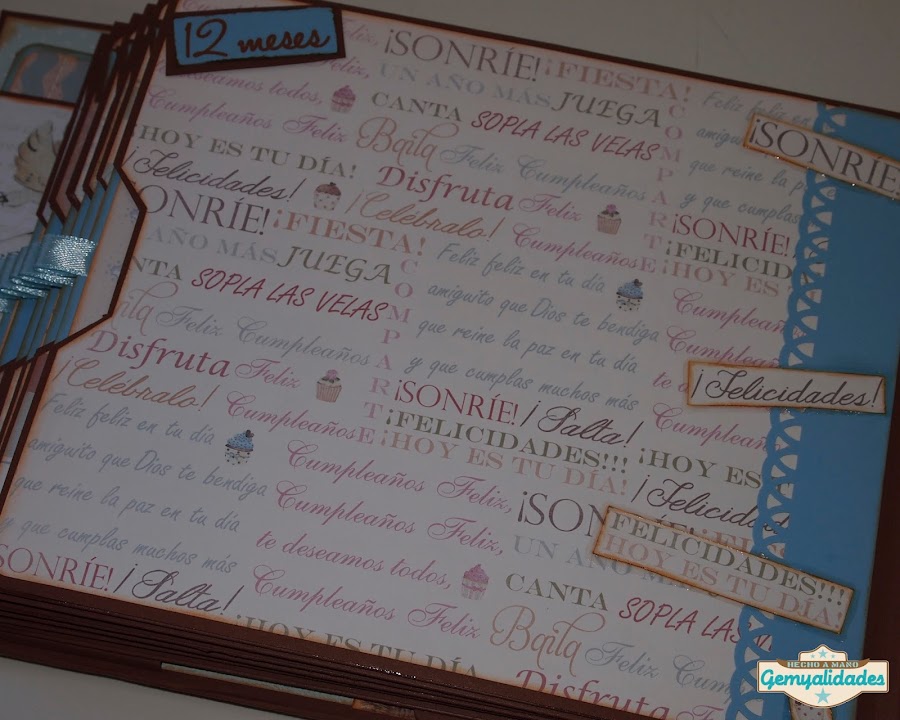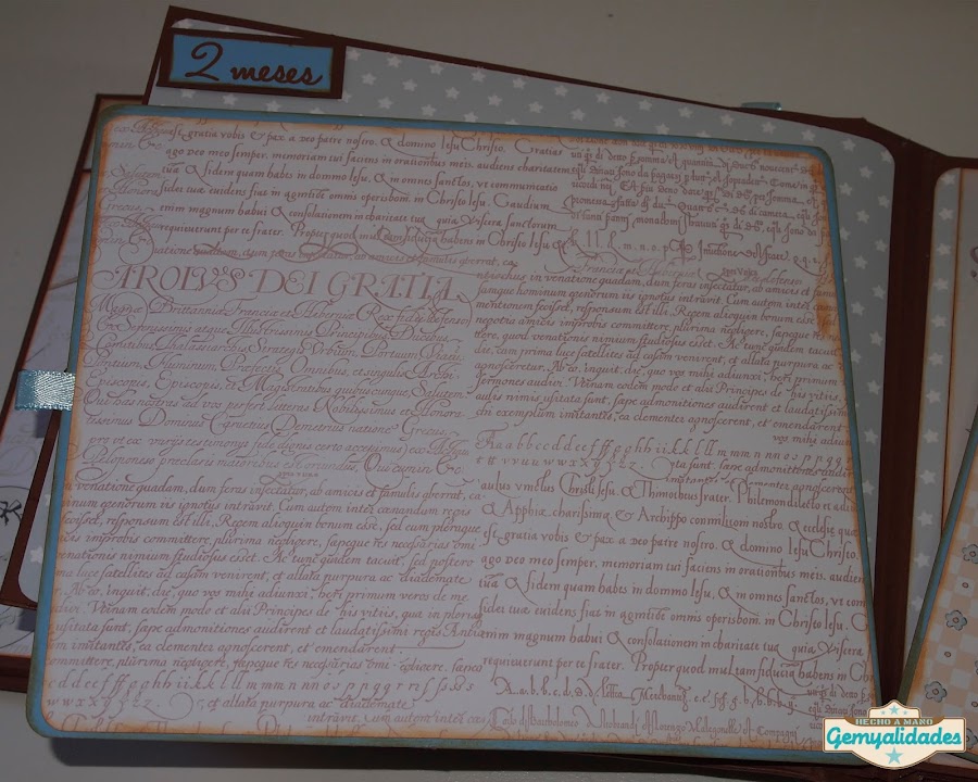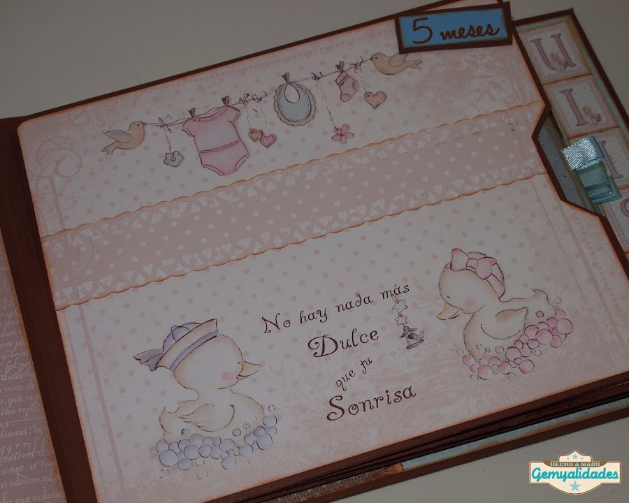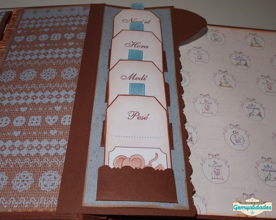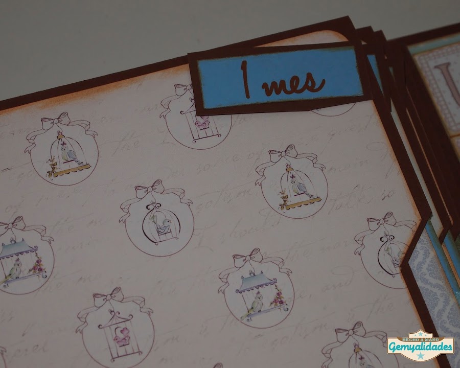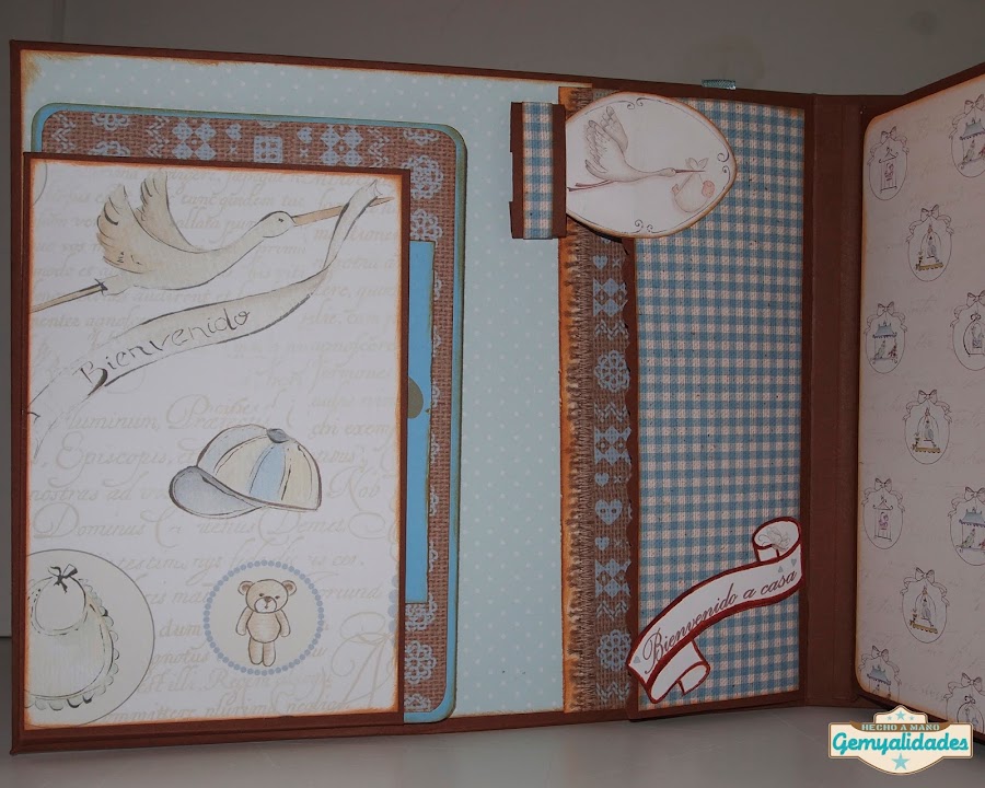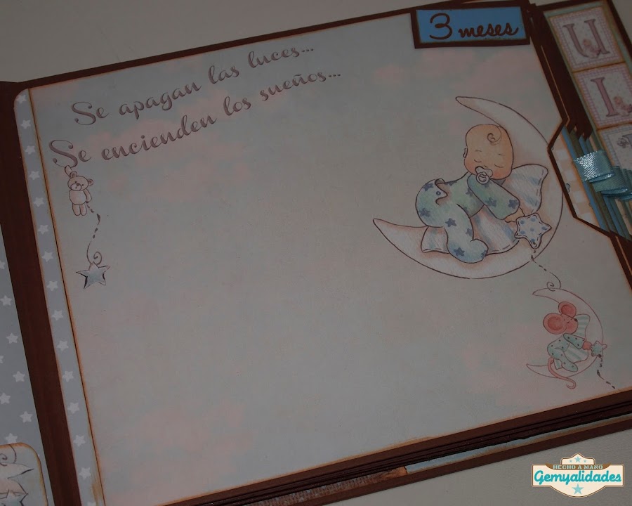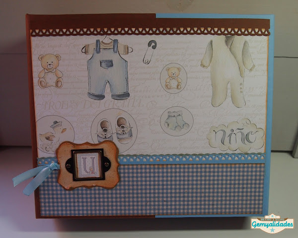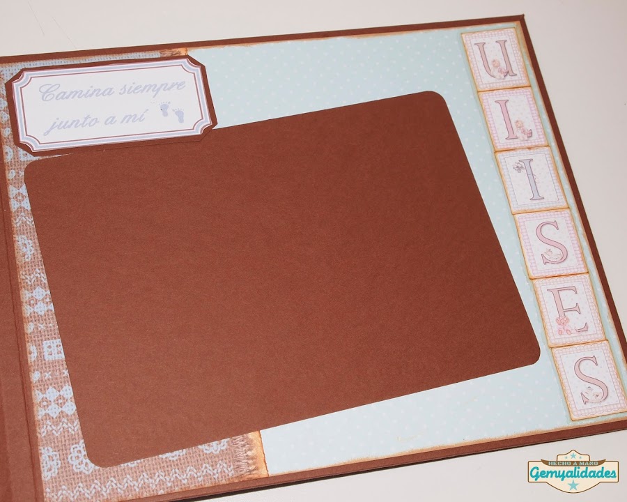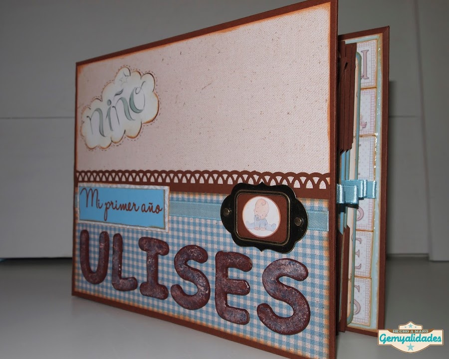 n esta entrada os quiero enseñar uno de mis últimos álbumes de scrapbooking, hecho con todo el cariño del mundo para mi amigo José Gabriel y su pareja Cati. En abril llegará al mundo su pequeño Ulises y me pidieron que les hiciera un álbum para poner las fotos de su primer año. Sus peticiones eran: que el formato fuera apaisado, no cuadrado como muchos de los álbumes que he hecho, que fuera en tonos pasteles pero que la base del álbum fuera de un color que contrastara bien con los papeles escogidos, también querían una caja compañera para guardarlo y protegerlo del paso del tiempo.