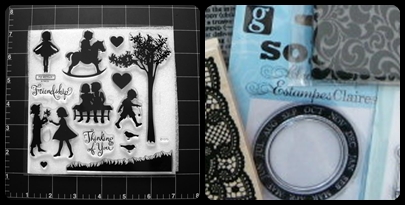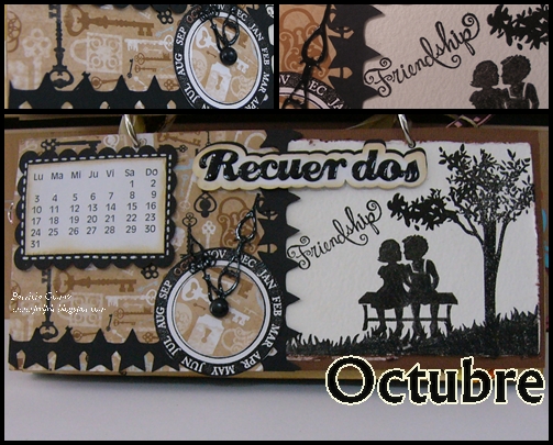 El marco del mes, las agujas del reloj, la palabra Recuerdos y los troqueles de estrella son de la Craft. El reloj-calendario es el sello Soloz Circle Months; los niños, el cesped, el arbol, el Friendship son sellos de la coleccion Close to My Heart-Childhood