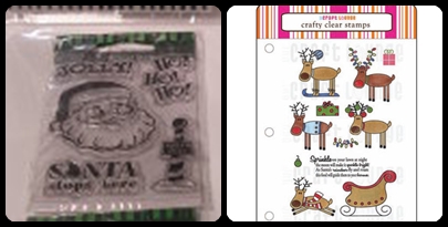 Son sellos de marca desconocida el Papa Noel y el Santa stops here junto con la indicacion del polo norte, mientras que el reno y el trineo son de la coleccion Our Craft Lounge - Reindeer Games. El copo verde y las ramas son troqueladoras de Martha Stewart.