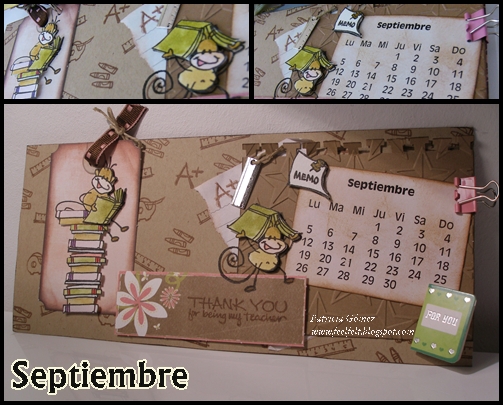 El mes de Septiembre recreado en el colegio, no podía ser de otra forma, trabajando MIA en uno. Para este mes, usé los sellos Stampendous School for Changito, con ellos creé el estampado del papel de la base, y tambien a los monitos, en la pila de libros, y el que tiene un libro en la cabeza. La nota de memo tambien es de este paquete. Añadí un charm de regla que creo que le da un toque muy gracioso, y el papel embosado de estrellas, lo recorte con la troqueladora que imita una libreta arrancada: