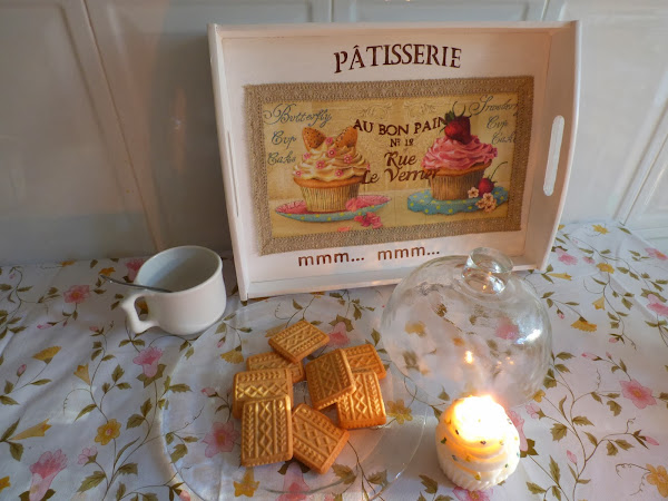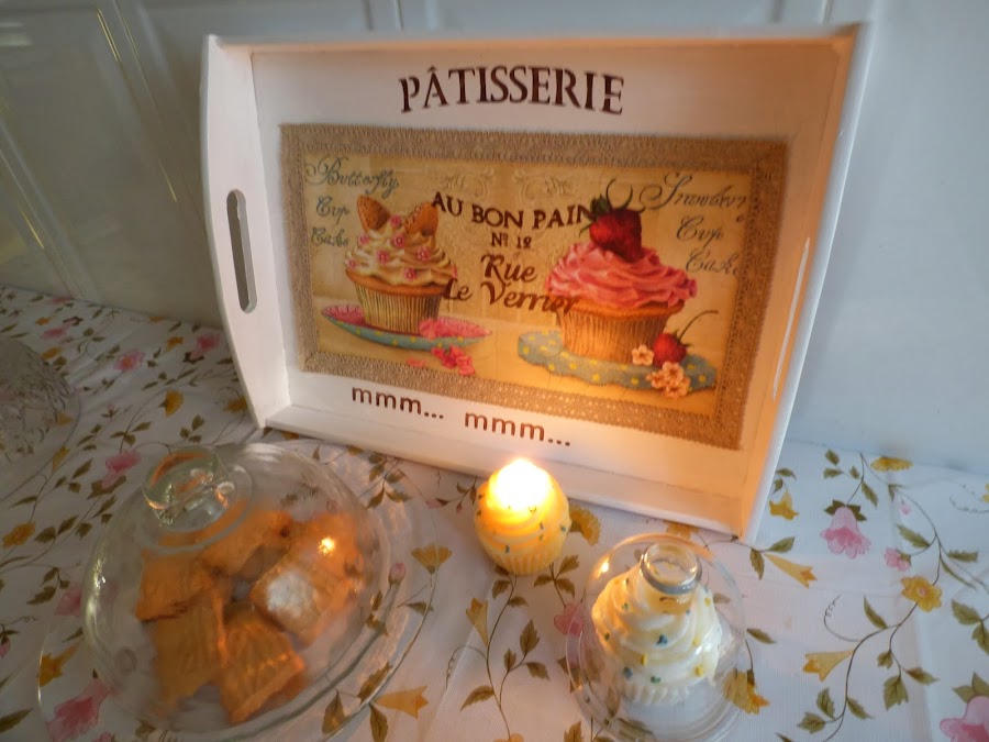 Esta bandeja lleva decoupage con esta servilleta tan preciosa, una de las que tenemos María y yo en nuestro blog en comun... una de las preferidas, de hech,o enseguida se agota