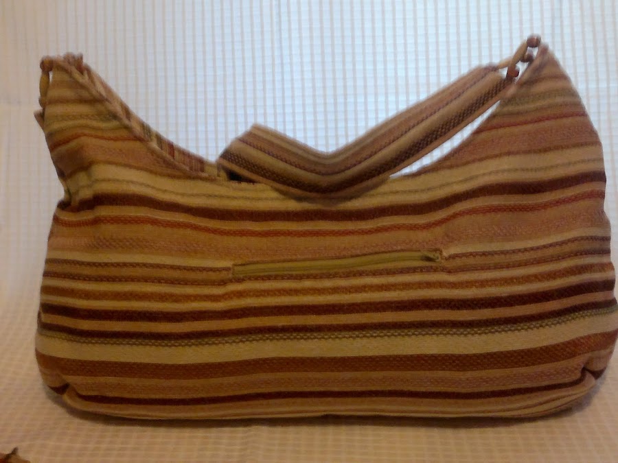 Bolso en tela hecho a mano con detalles en polipiel marron y decorado con flores en tela a juego, forrado interior, bolsillo exterior con cremmallera.