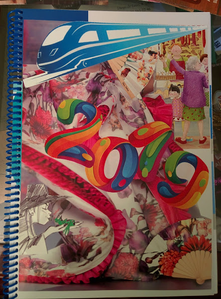 Como podéis apreciar es un collage con distintas fotos y dibujos, un tren de alta velocidad porque espero poder viajar más que este año que termina, el mercado porque quiero practicar más en la cocina, la brujita besando a la rana porque espero que si beso alguna el resultado sea genial, las flores porque me gustan y los abanicos porque son imprescindibles para los calores de Zaragoza. El número de este año colorido y alegre porque espero que sea de lo más alegre y dicharachero todo lo que pase en los 365 días que están por comenzar.
