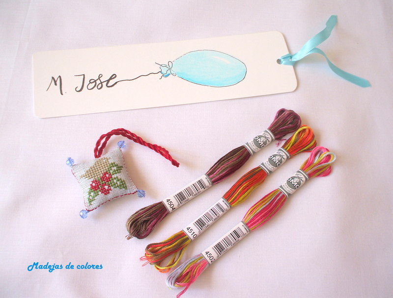 Madejas multicolor para seguir bordando, un precioso buscatijeras, con un pajarito, rematado con piedras de cristal y un original y delicado marcador de libros, donde pudo aplicar sus clases de escritura.