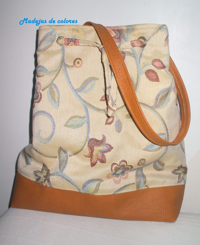 Este otro estilo saco, misma polipiel en base y asa, con una tela de fondo crudo y un bonito estampado de flores en azules y rojos.