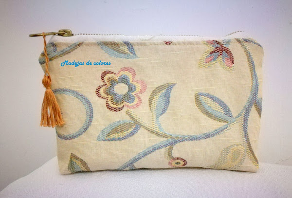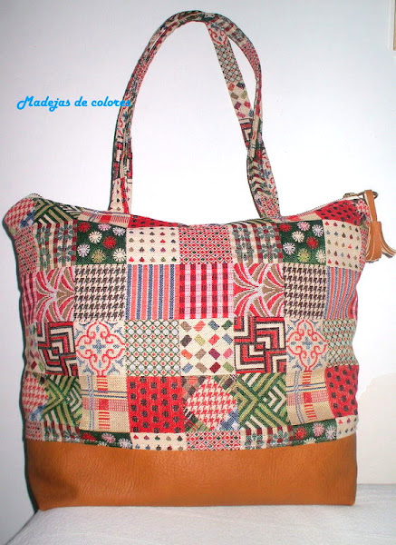 Un bolso con una tela estampada imitando el patchwork, en tonos rojos, verdes y azules. La base con polipiel marrón, lo mismo que el borlón que colgué de la anilla de la cremallera. Tiene bastante capacidad.