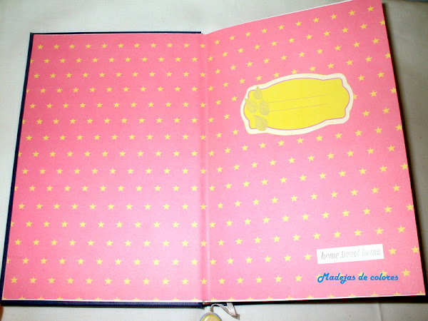 En su interior un papel rosa con estrellitas amarillas y el bocadillo para poner mis datos. En una esquina una cinta grabada con la frase "Home sweet home", aunque no se aprecia bien en la foto.