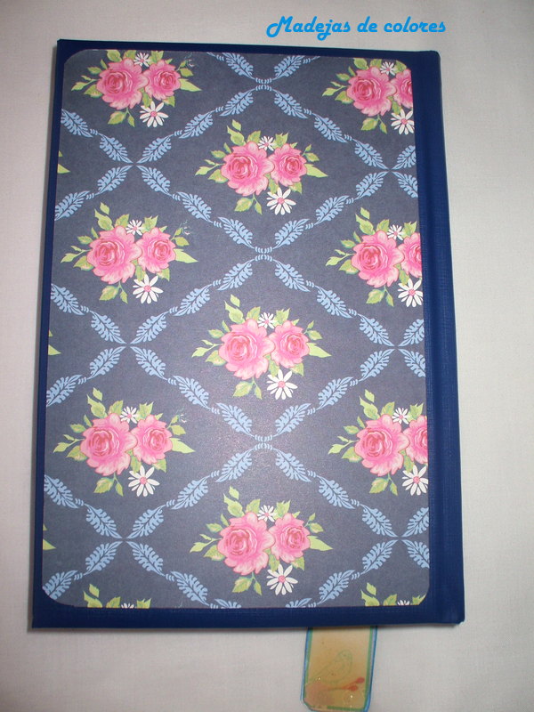 La contraportada también lleva un precioso papel azul lleno de rosas. Debajo se ve la otra cara del marcado, con un pajarito.