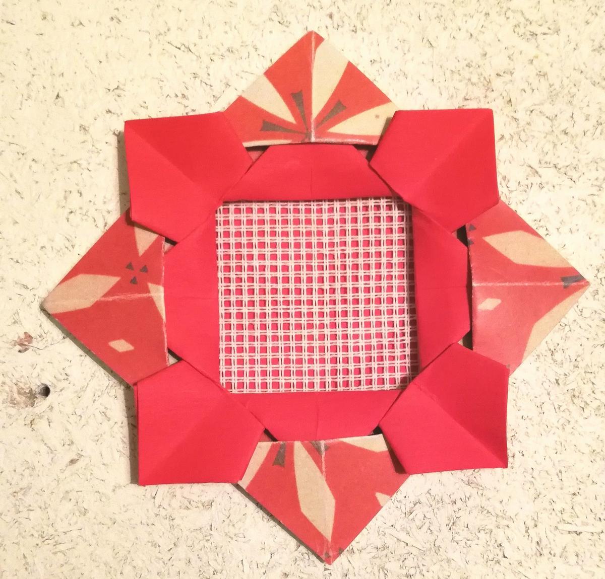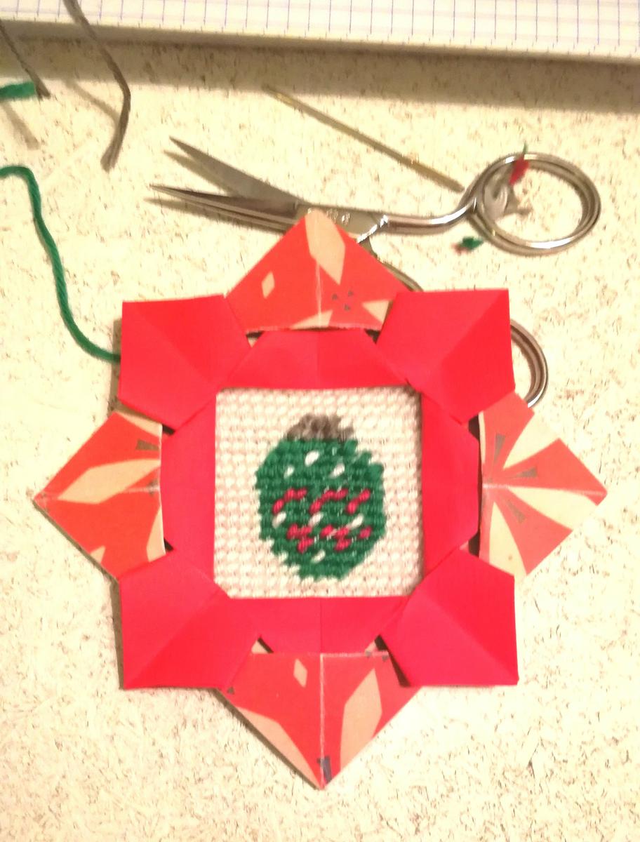 Tras colocar la labor con mucho muchísimo cuidado en el marco… sólo falta perforar en el pico superior para pasar un cordel ¡y colgarlo del árbol de Navidad!