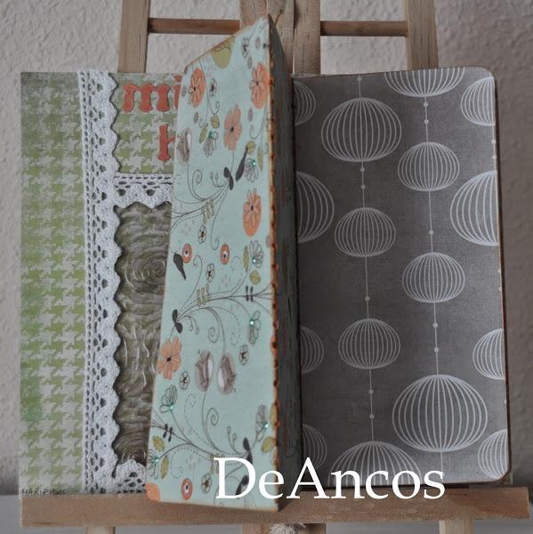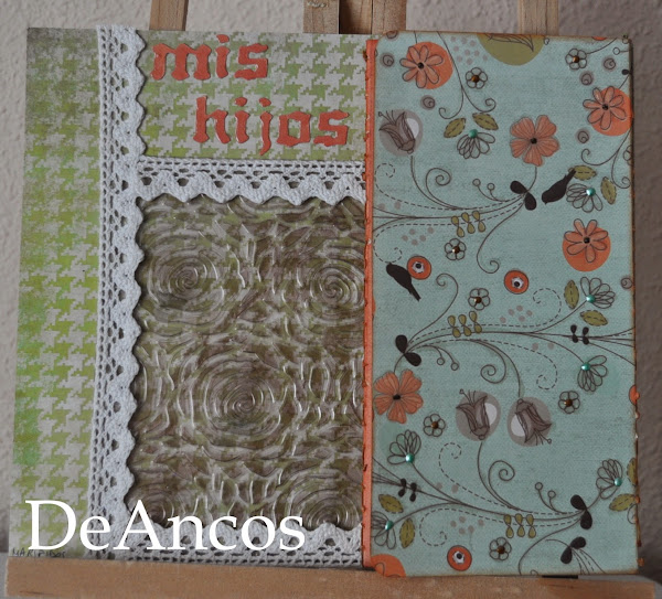 Ésta es la página que hice para que Ana pusiera fotos de sus hijos. Encima de ella hay un miniálbum cosido donde poner esas fotos. La página base está decorada con puntillas adhesivas que bordean un embosado en acetato, envejecido con tinta Stazon.