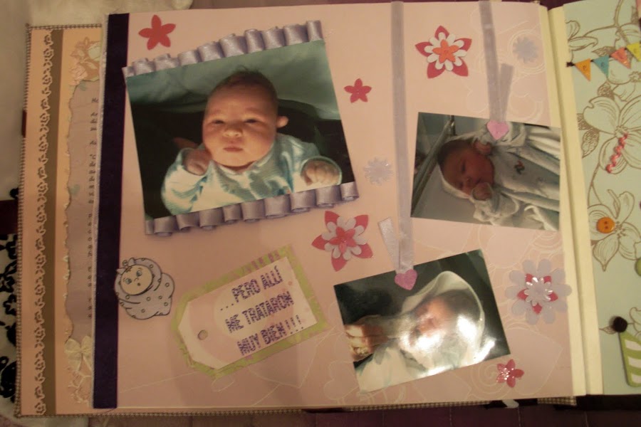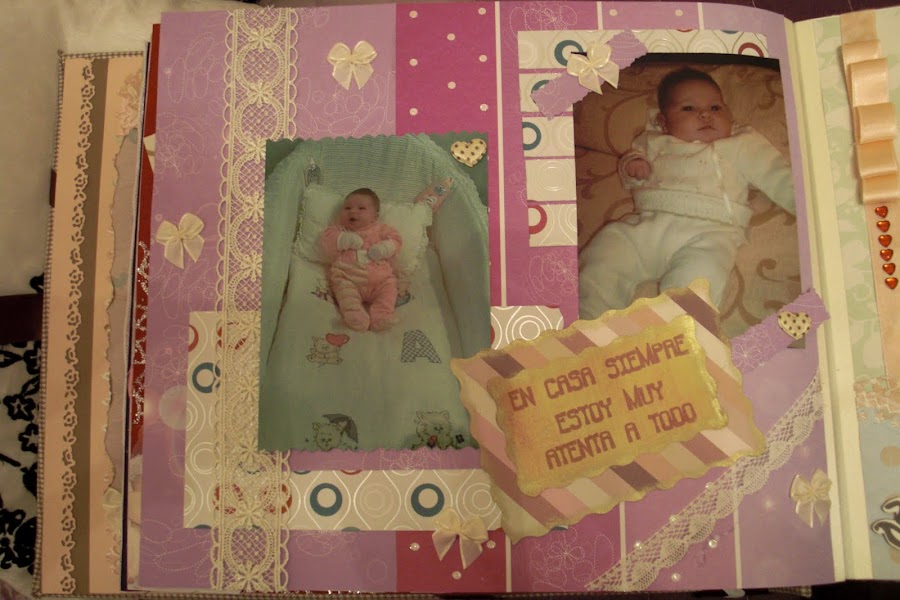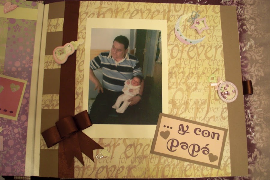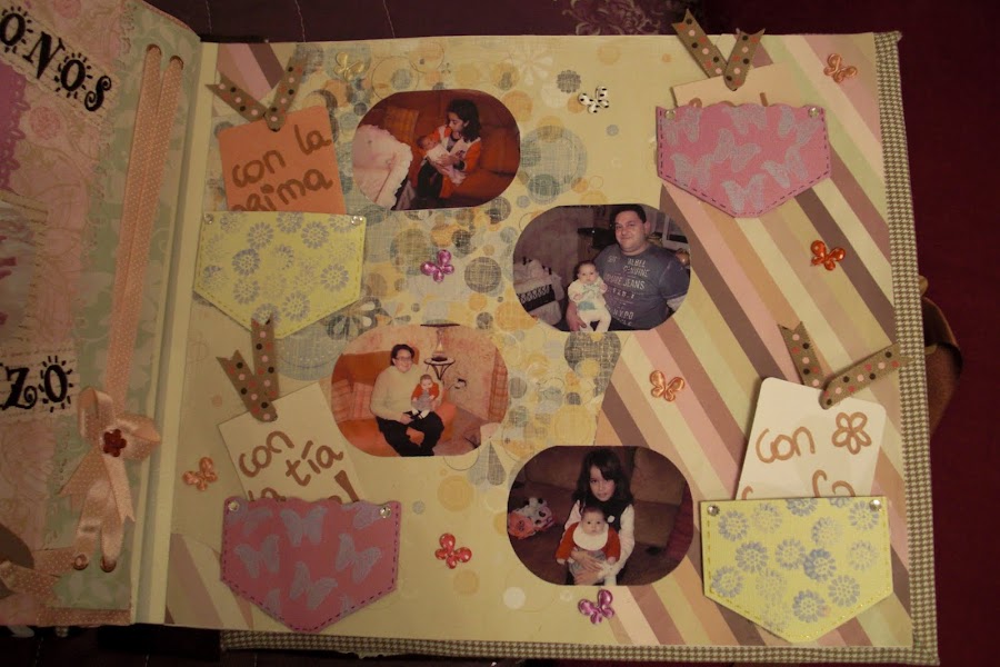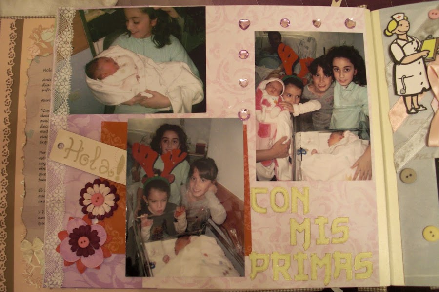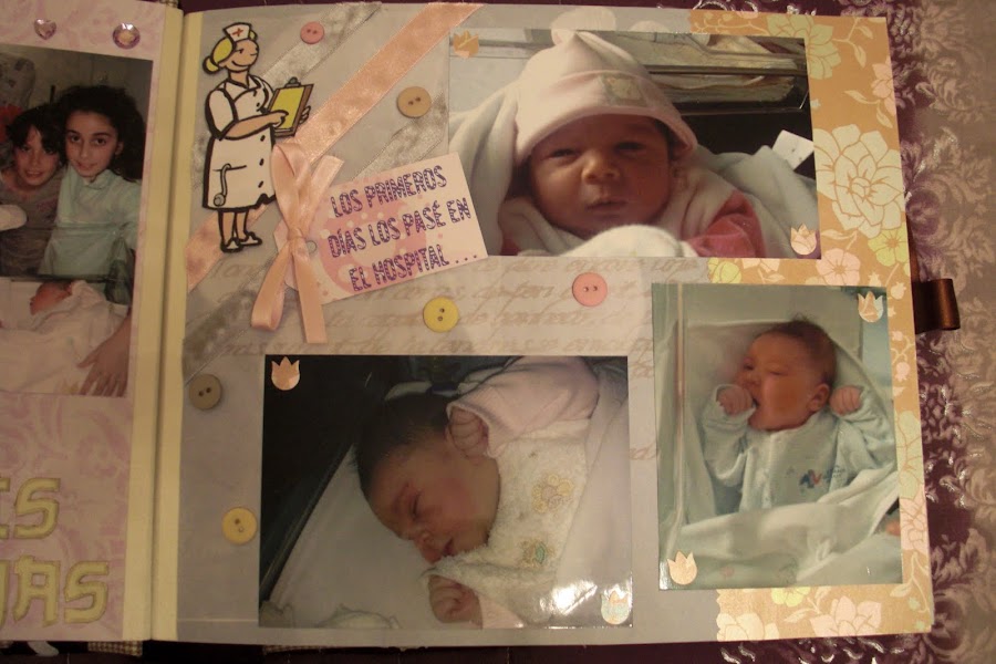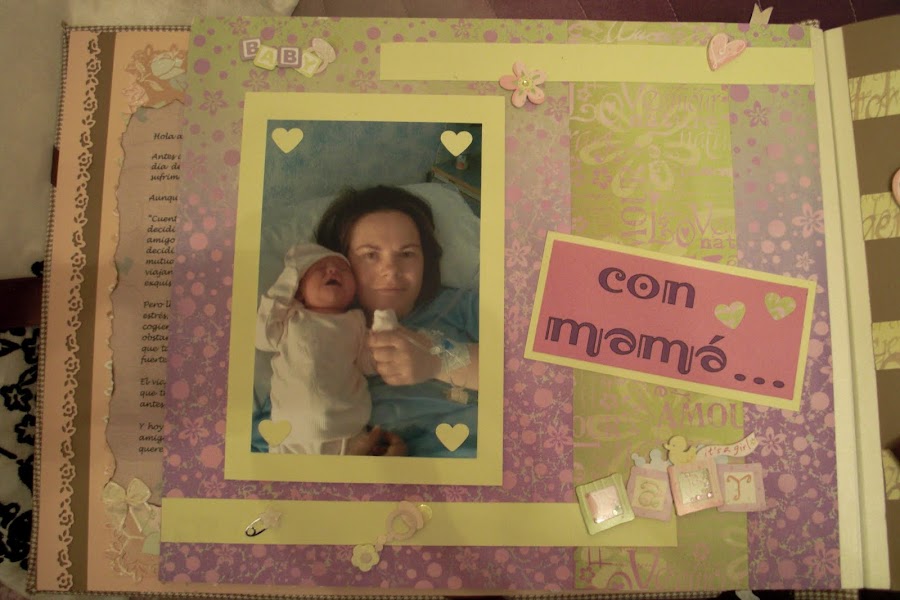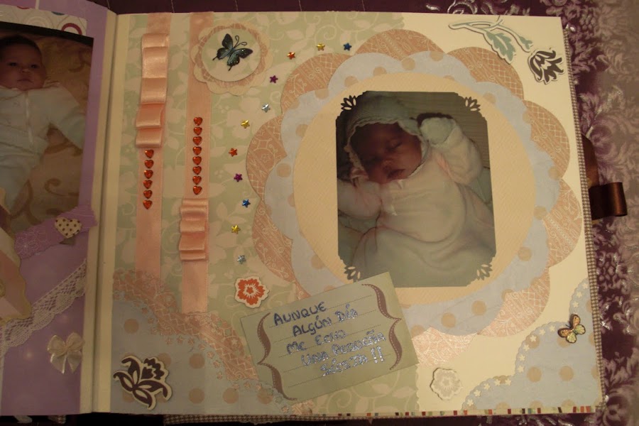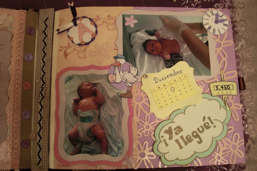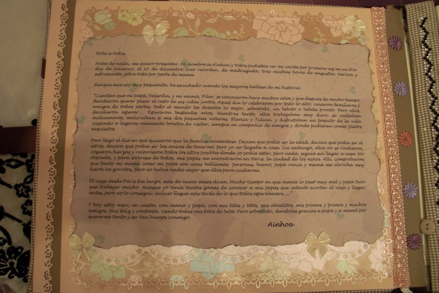 Nuevamente estoy aquí para seguir actualizando mi blog con todos mis trabajos. En este caso les presentaré mi primer trabajo de Scrapbooking: un álbum de fotos muy especial. El tema principal era la llegada al mundo de mi prima Ainhoa, una niña muy buscada y esperada por todos. Para darle mayor "sentimentalismo", hubo complot para que los padres no tuvieran ninguna foto de los primeros días de su bebé.