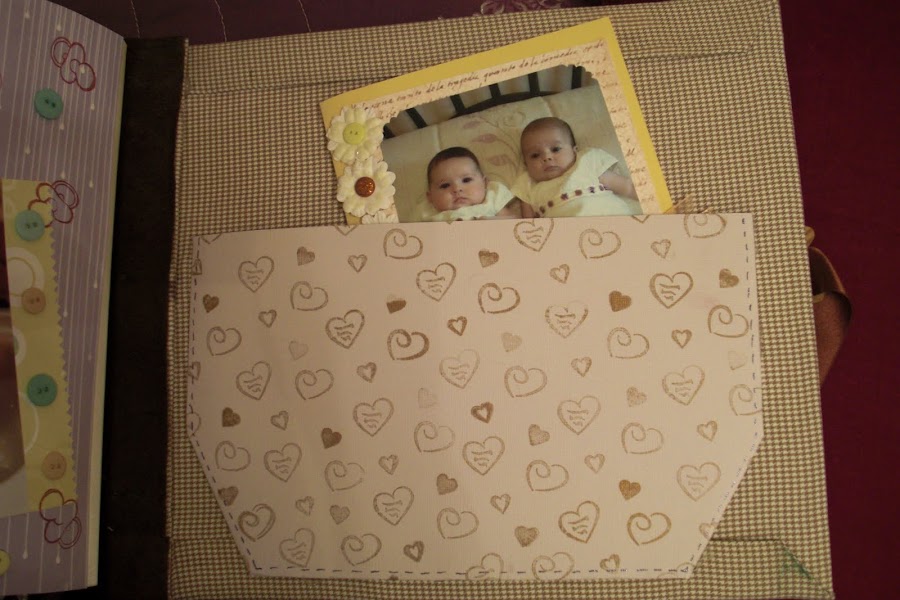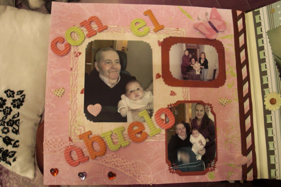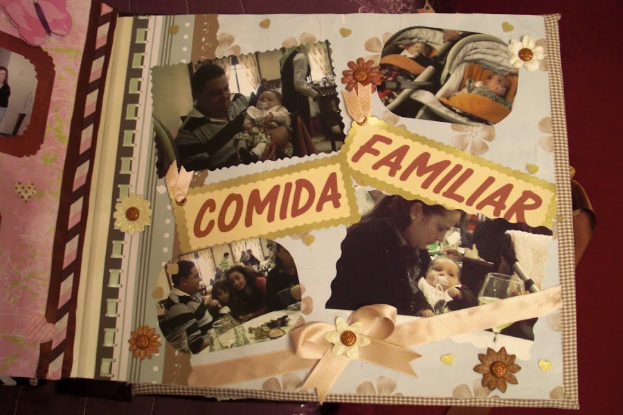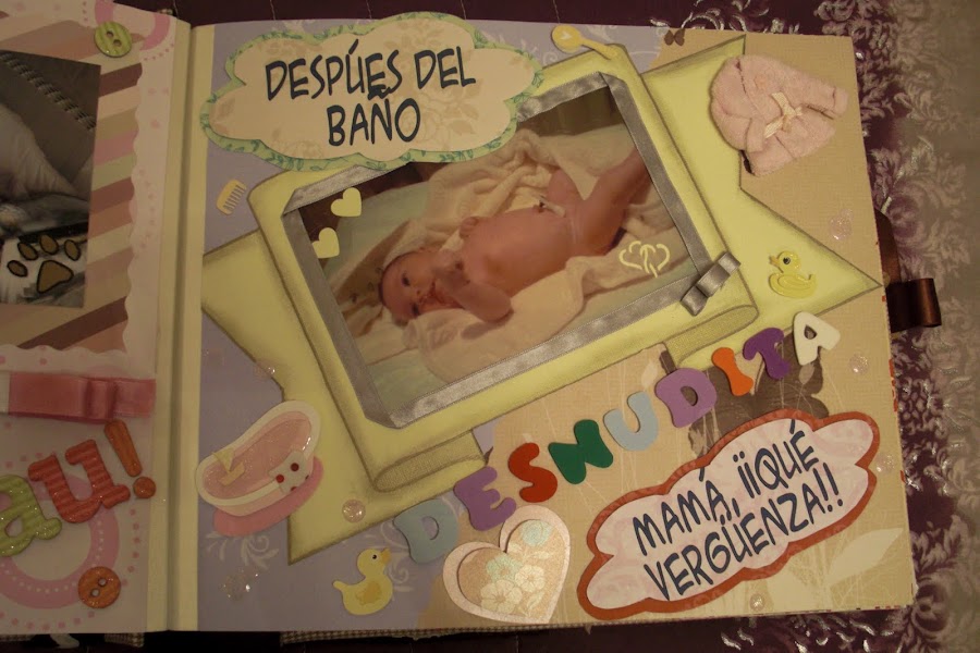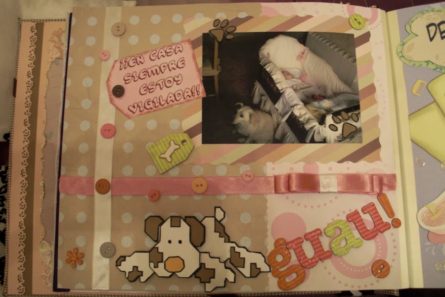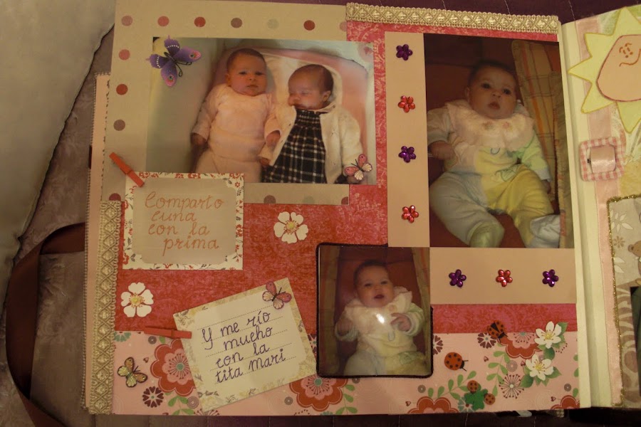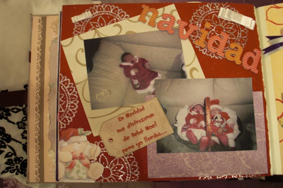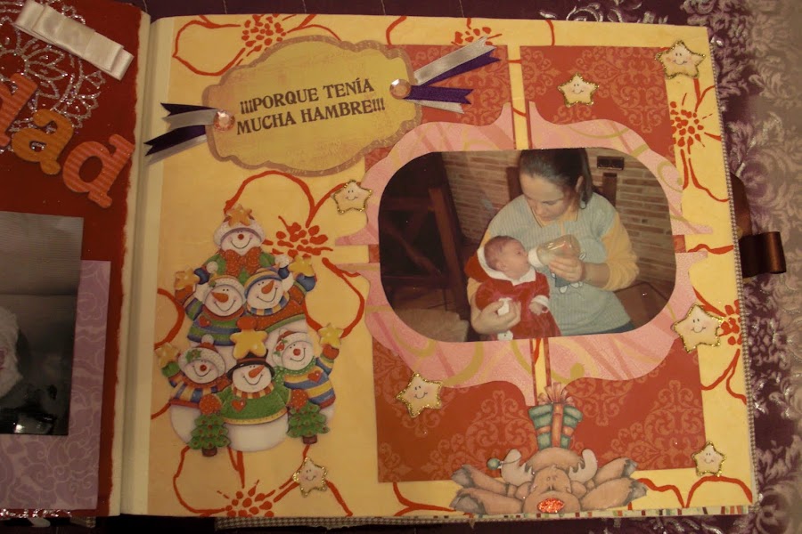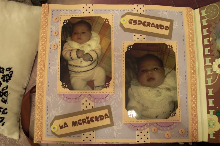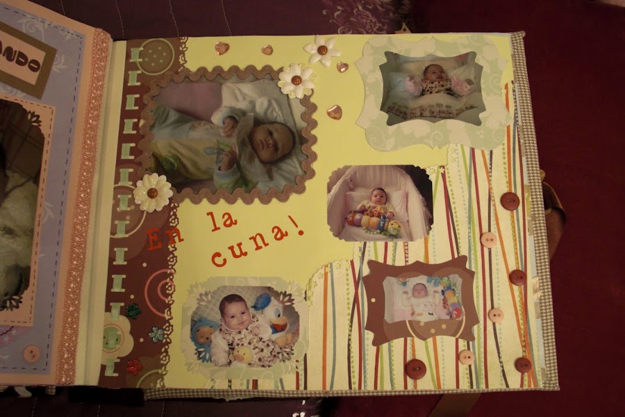 A continuación les dejo las imágenes del álbum, la portada está forrada con tela vichy en tonos marrones y crema (los favoritos de la madre de la criatura) y los adornos algunos son comprados y otros hechos artesanalmente. En la contraportada, no sé si se podrá apreciar bien, pero cuenta la historia de su nacimiento. Espero que os guste. A mí me encantó hacerlo y a mis tíos recibirlo por sorpresa como regalo de Reyes.