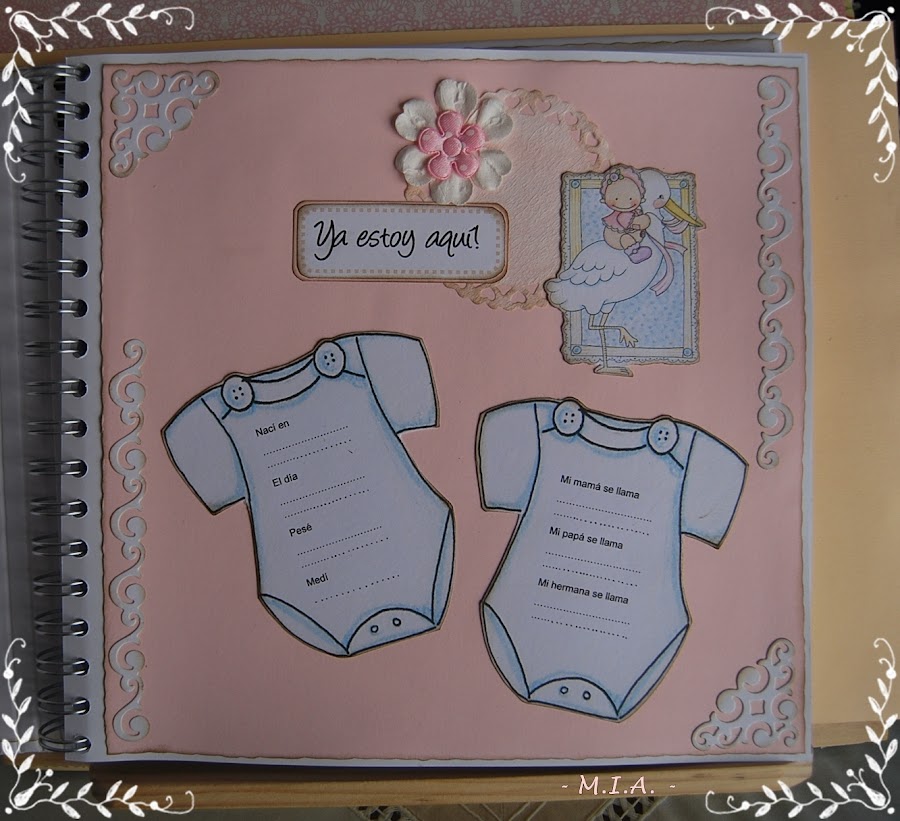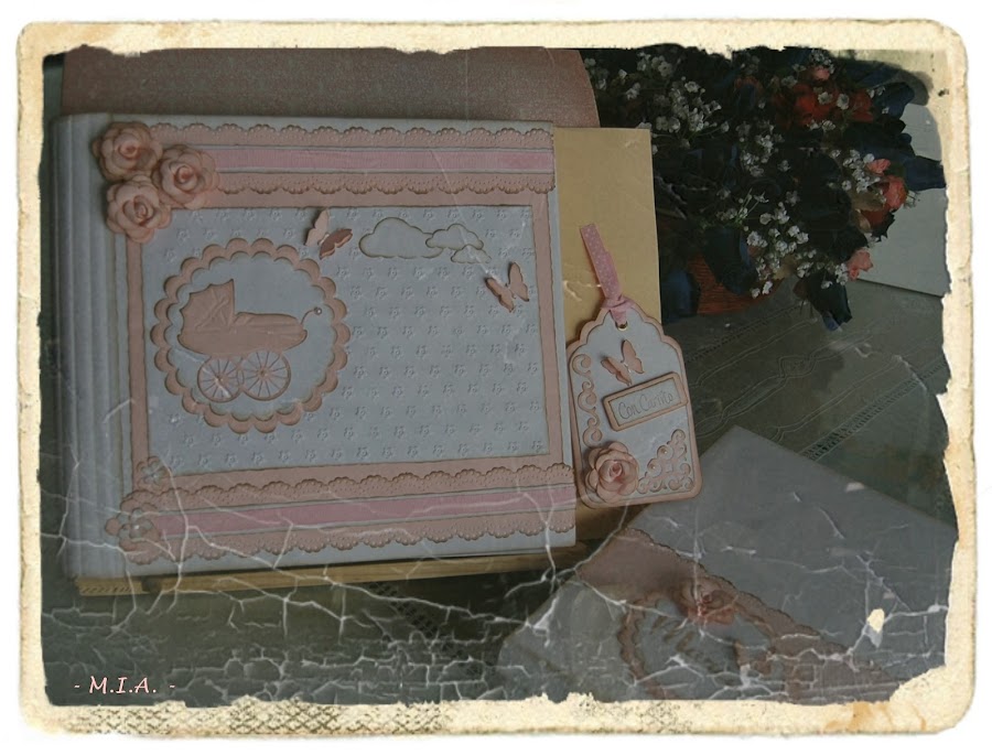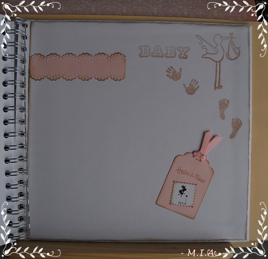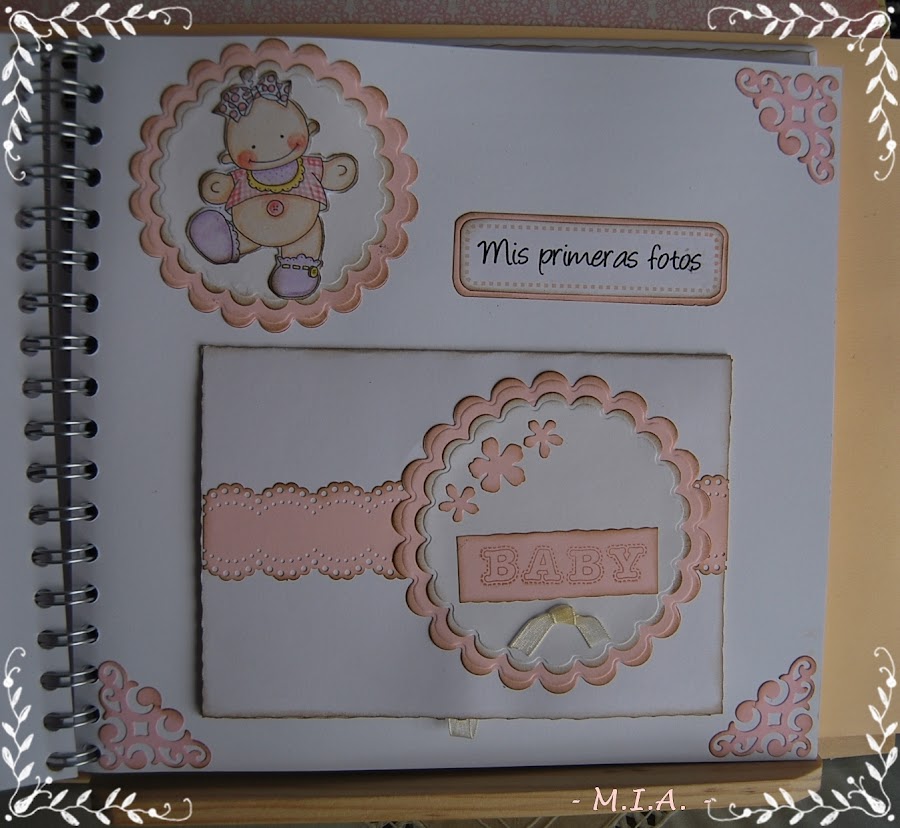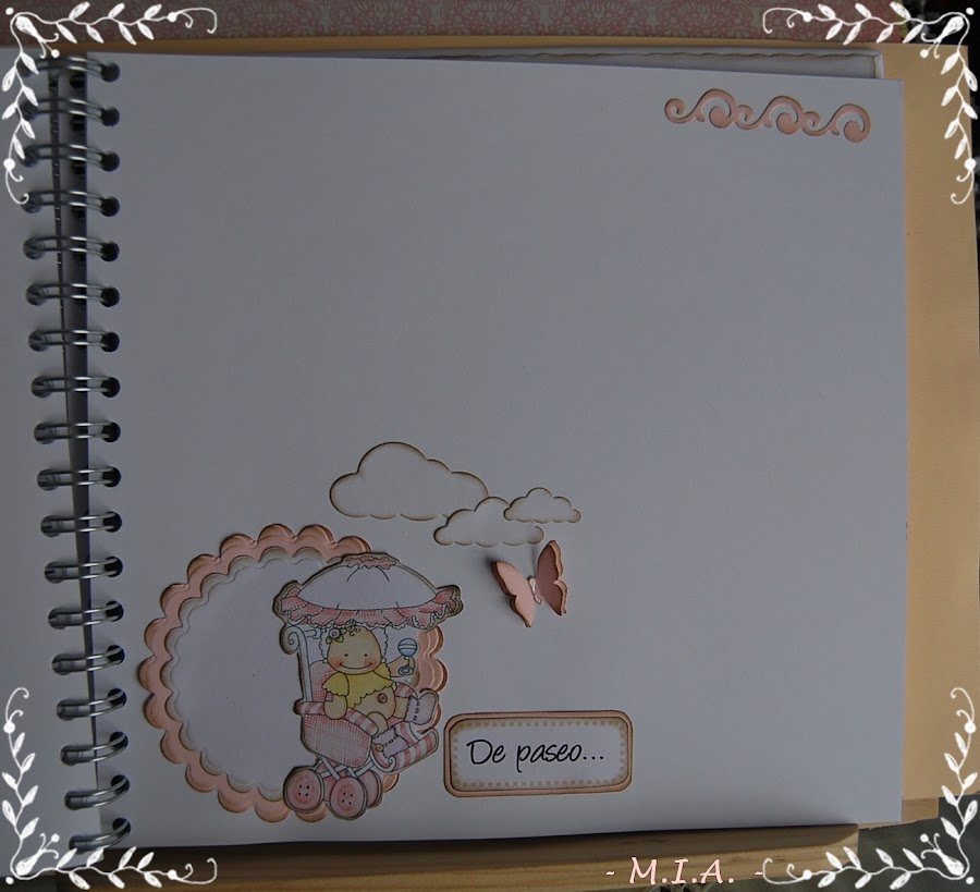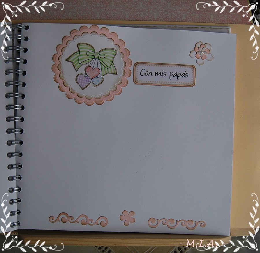 Las flores son caseras y todo está entintado con tinta Distress walnut stain... Lleva unos scalops en todas las páginas con un letrero alusivo a las fotos y adornados con flores, mariposas, nubes o esquineros troquelados.
