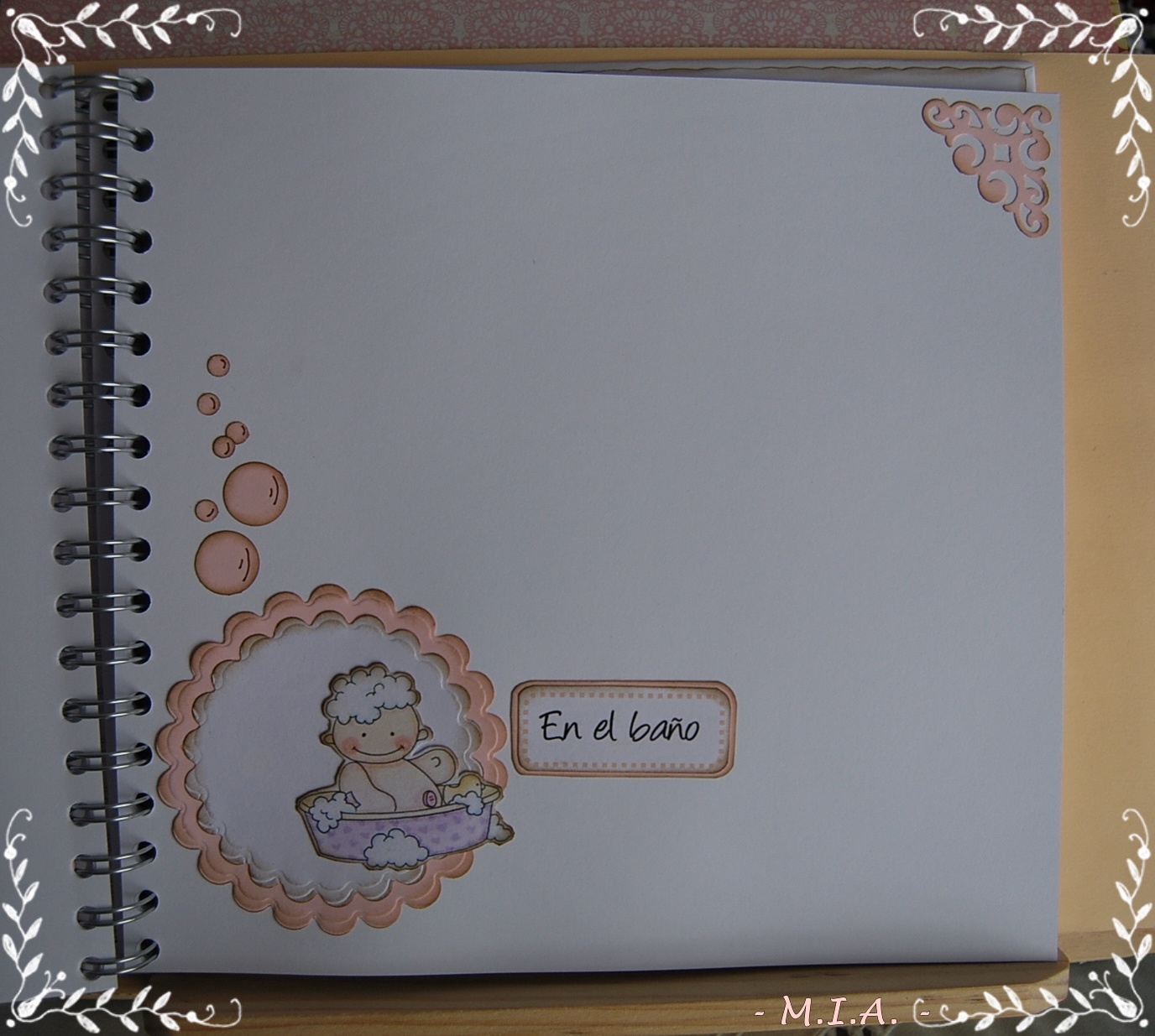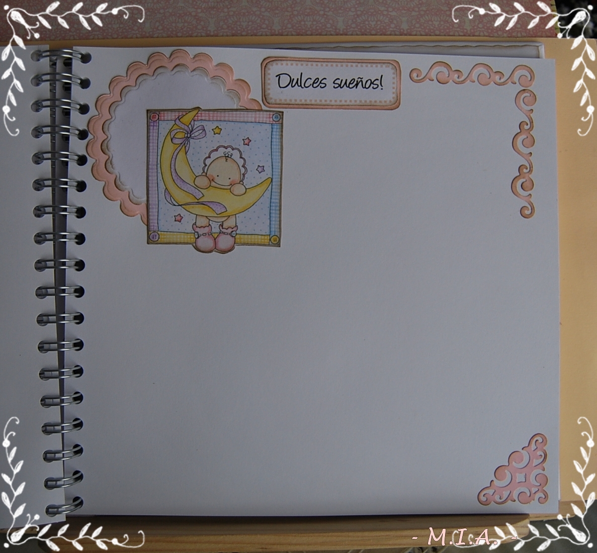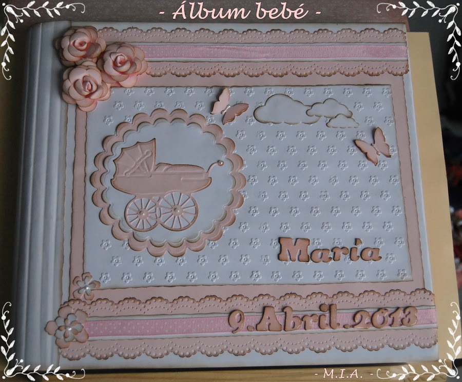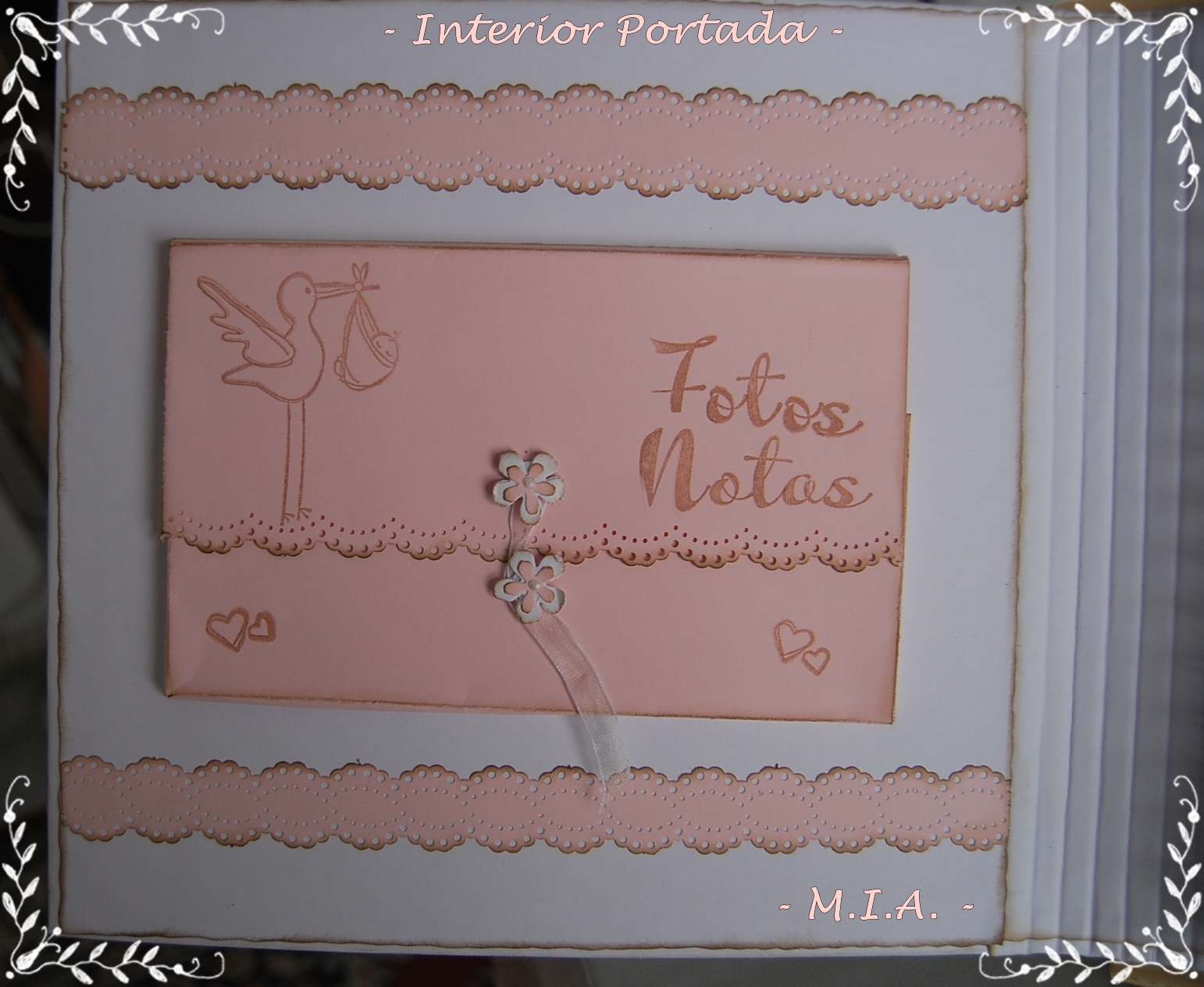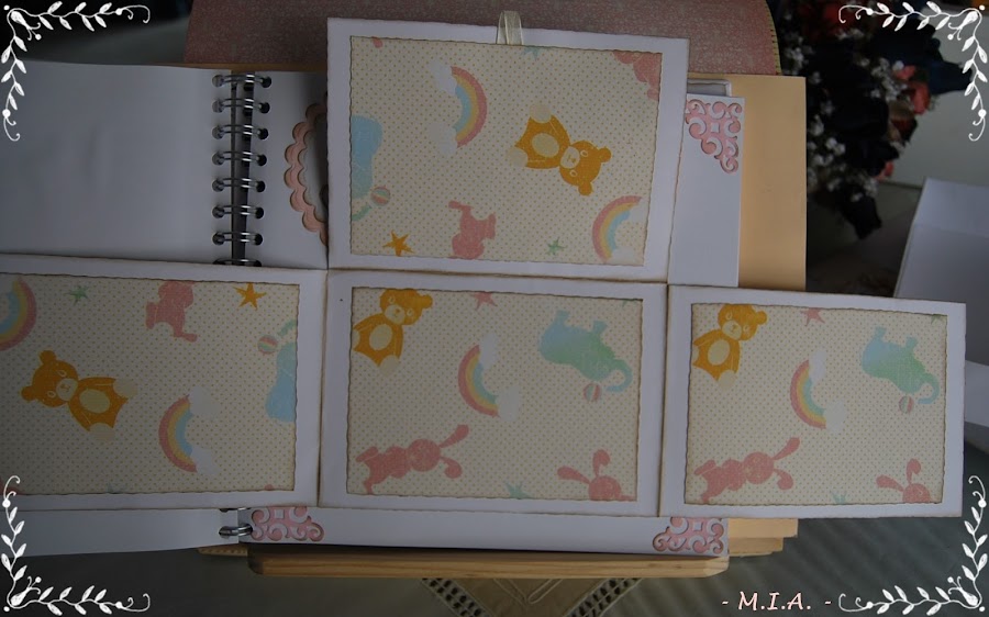 Las flores son caseras y todo está entintado con tinta Distress walnut stain... Lleva unos scalops en todas las páginas con un letrero alusivo a las fotos y adornados con flores, mariposas, nubes o esquineros troquelados.