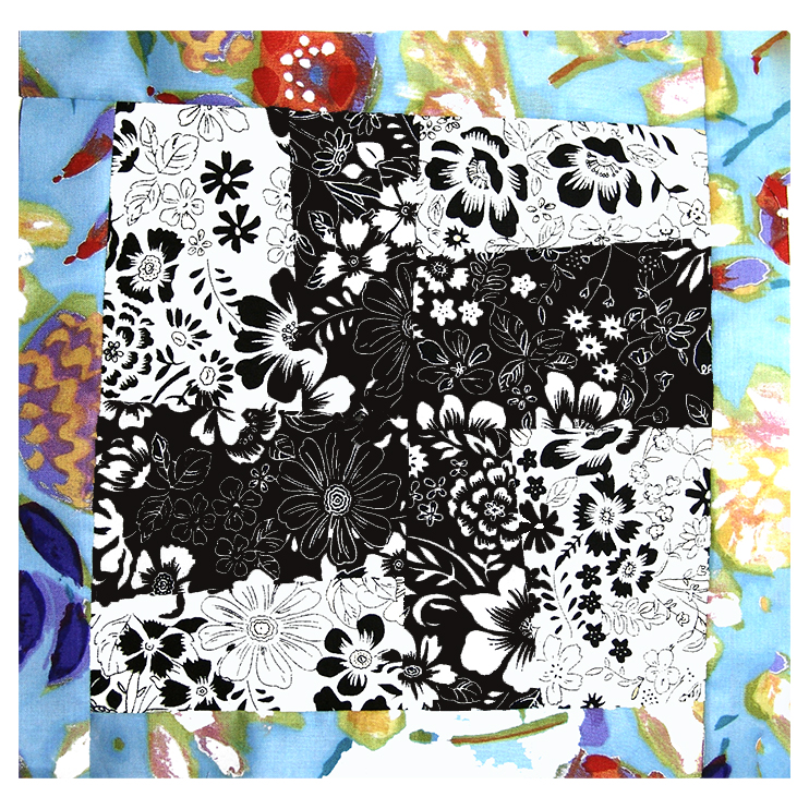 Empezamos el tutorial dándoos las medidas y cantidades, aunque las encontraréis en el anexo. Nosotras hemos usado tres tejidos: los del bloque, propiamente dicho, en dos telas en blanco y negro, con el mismo estampado, pero con efecto negativo/positivo. De estas necesitamos 2 cuadrados de cada de 12X12cm. Para rematar el bloque hemos usado tiras en un estampado de flores, muy pictórico, que no tiene nada que ver con las centrales, para contrastar al máximo. Os aconsejamos que cortéis las tiras con el bloque hecho y que ajustéis la medida de largo; más o menos necesitaréis 50cmX3cm de ancho (1).